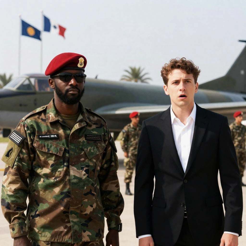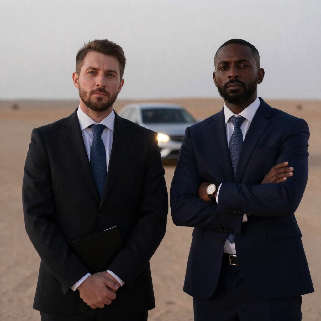 Photograph of two men in suits standing side by side in a desert landscape at dusk. Both men have serious expressions. The man on the left holds a black folder, the man on the right has arms crossed. Background includes a blurred car and glowing lights. The man on the left has light brown hair and a beard, the man on the right has a short beard and dark skin.