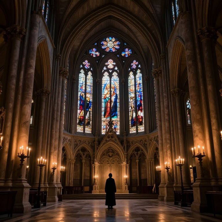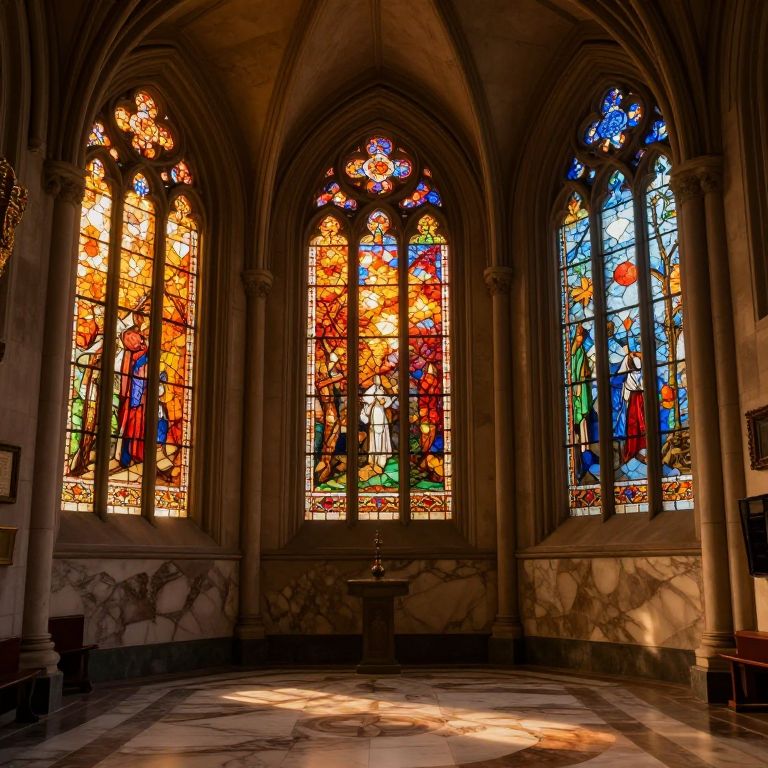 Gothic arches frame vibrant stained-glass windows, casting fiery autumn hues onto a polished marble floor, illuminated by warm ambient lighting within a grand cathedral interior.