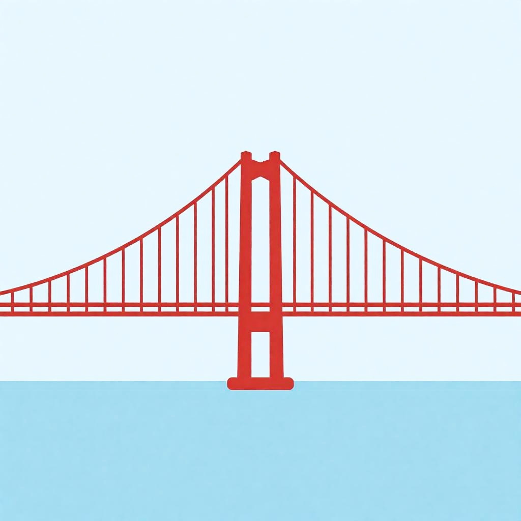 Minimalist line art of a large red suspension bridge spanning across calm blue water, simple shapes and bold clean lines, modern graphic style with flat design, no background details, calm and clean atmosphere