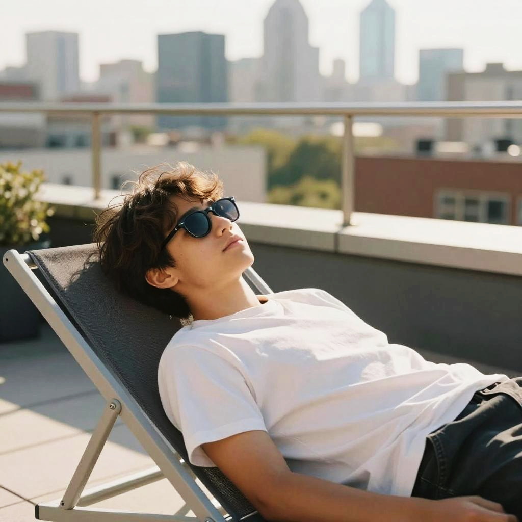 Teen sunbathing on a rooftop terrace, city skyline view, warm sunlight bathing the scene, casual summer outfit, sunglasses perched on nose, calm and contemplative mood