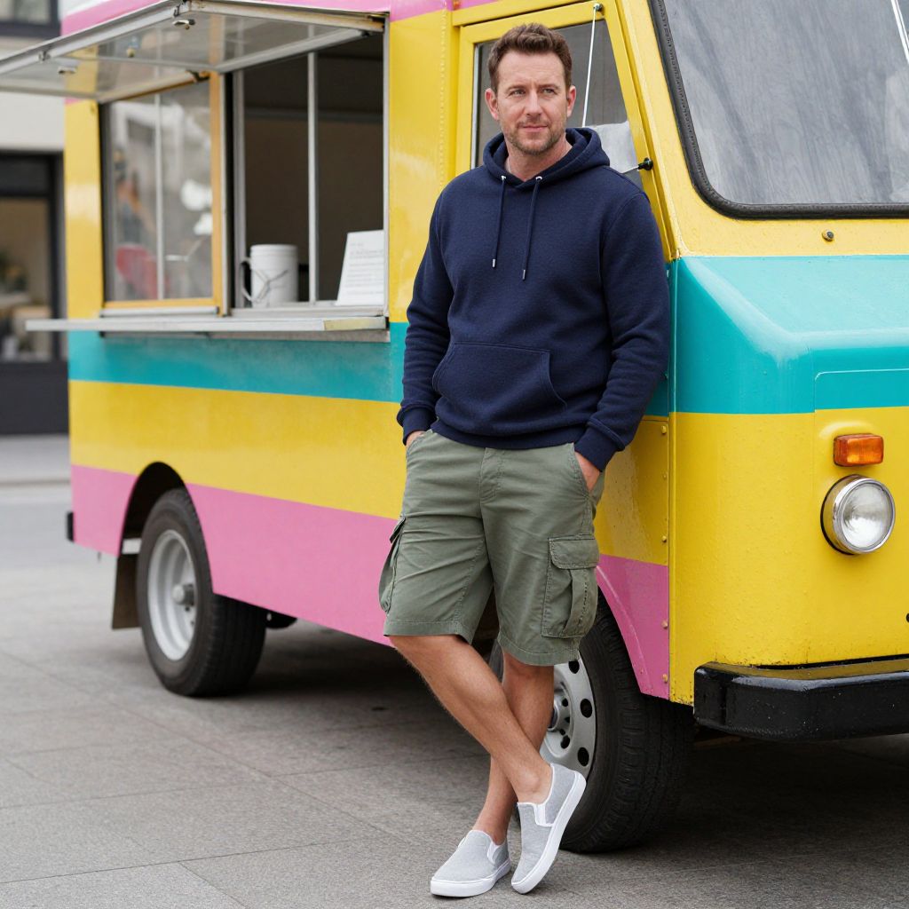 A man, navy pullover hoodie, olive green cargo shorts, light grey slip-on trainers, casual chic, urban plaza, vibrant food trucks, cinecolor, leaning against a food truck, relaxed smile, hands in pockets.Man has masculine face and piercing eyes