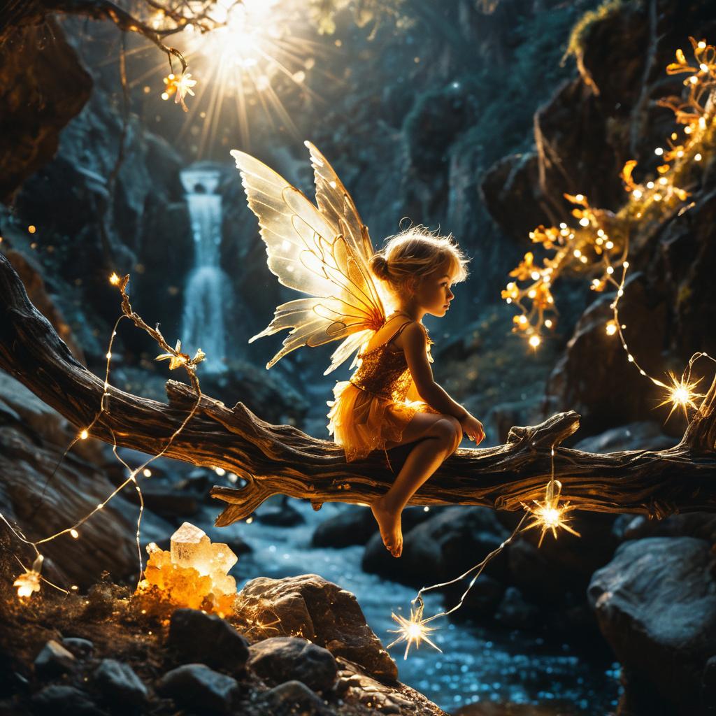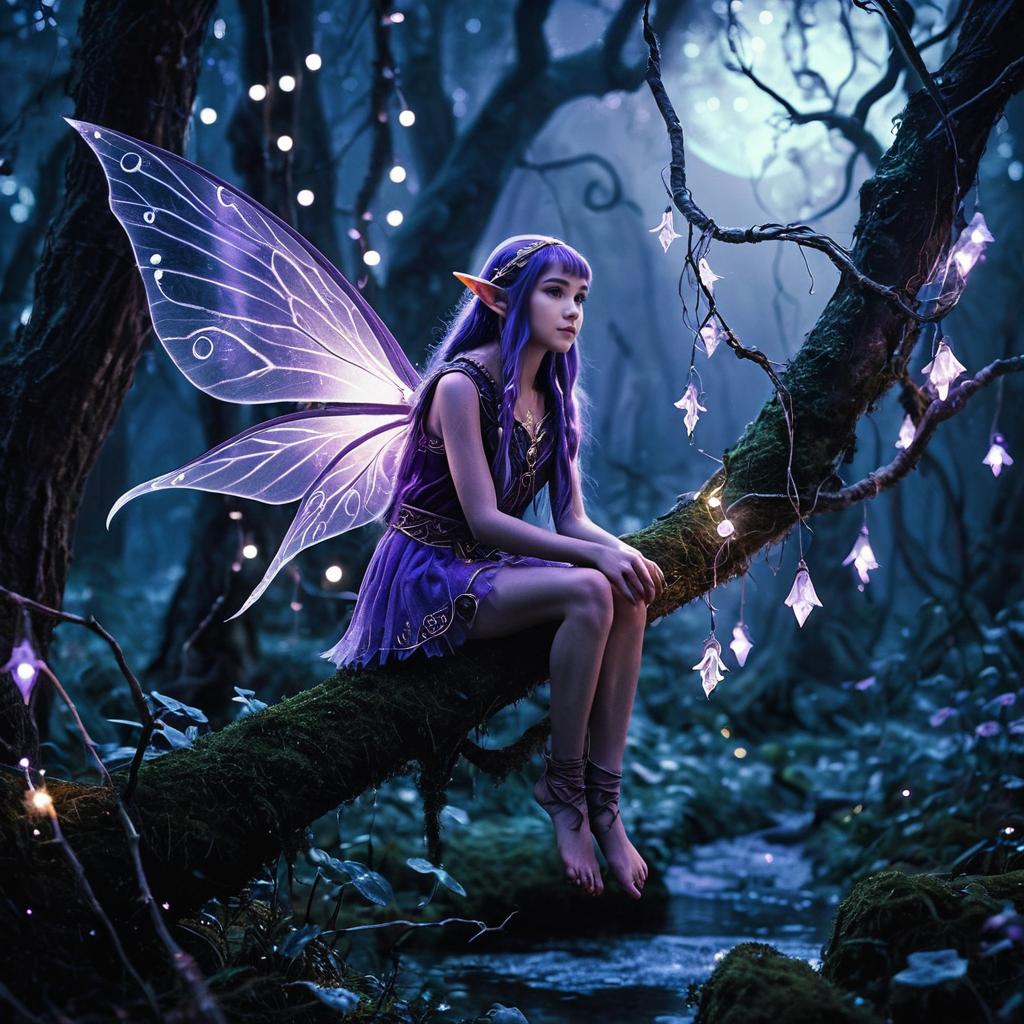 A fantasy photograph of a small tiny violet pixie with translucent wings and glimmering star dust in an enchanted twilight moor. The fairy is perched on a branch, surrounded by glowing moonbeams and twinkling fairy lights, with dusky purples creating a dreamlike atmosphere at dusk.