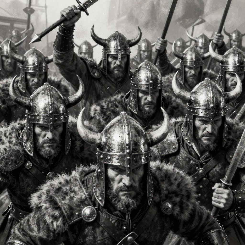 This is a black-and-white digital drawing of a dense crowd of fierce Viking warriors. They're all wearing detailed metal helmets with horns, and their faces are grim and determined. The warriors are closely packed together, with their arms raised and holding weapons, creating a sense of chaos and battle readiness. The drawing has a high-contrast, gritty texture, giving it a dramatic and intense atmosphere.