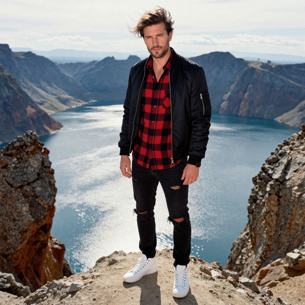 A man, plaid flannel shirt in red and black, distressed black skinny jeans, white high-top sneakers, layered with a black bomber jacket, standing on jagged cliffs, shimmering blue lakes below, Cibachrome style, confident expression, wind tousling hair. Man has masculine face and piercing eyes