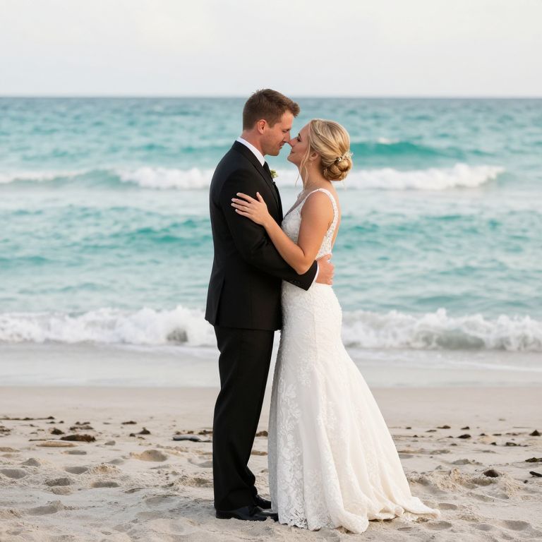 Couples embrace tenderly on Miami Beach, their wedding attire contrasting beautifully against the serene backdrop of turquoise waves and sandy shores.