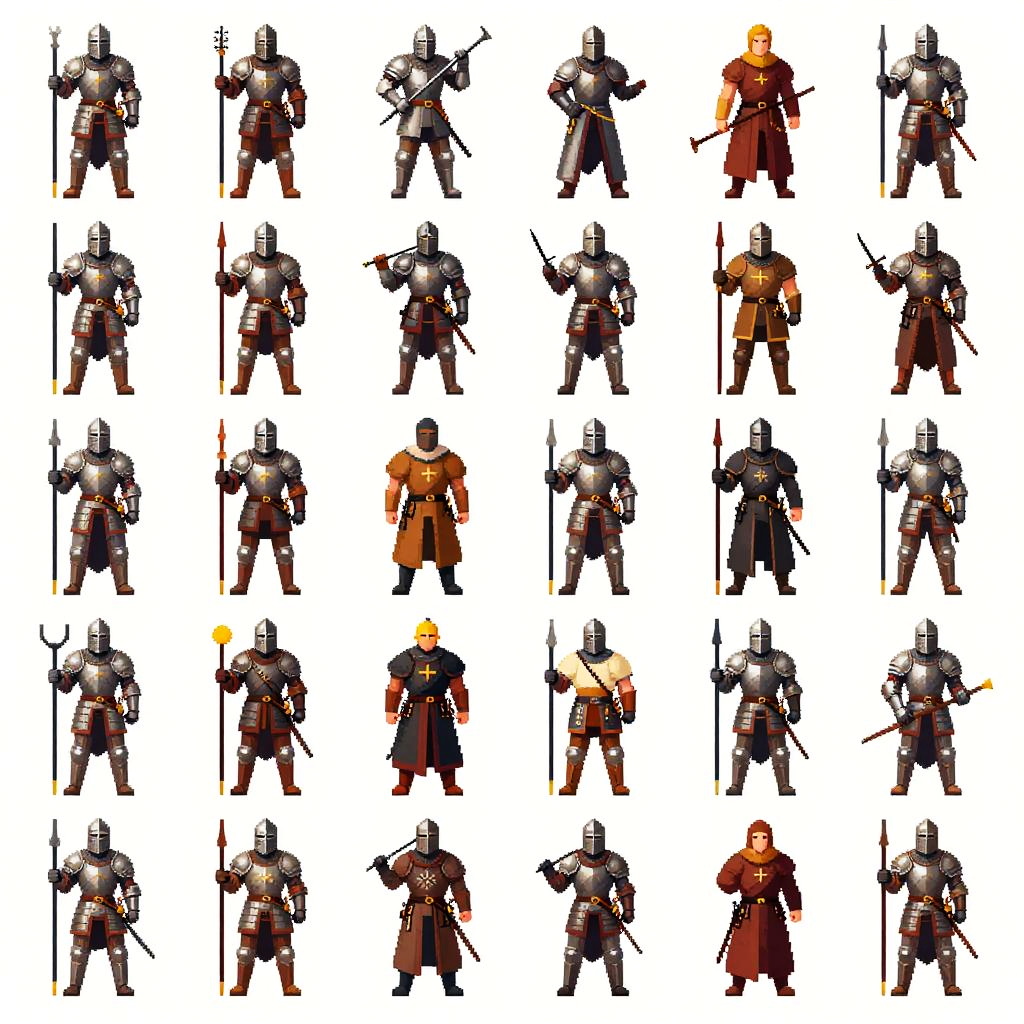 AI generated sprite sheet portraying medieval warriors with armor variations and detailed combat animations, rich textures, and a consistent pixel art style throughout