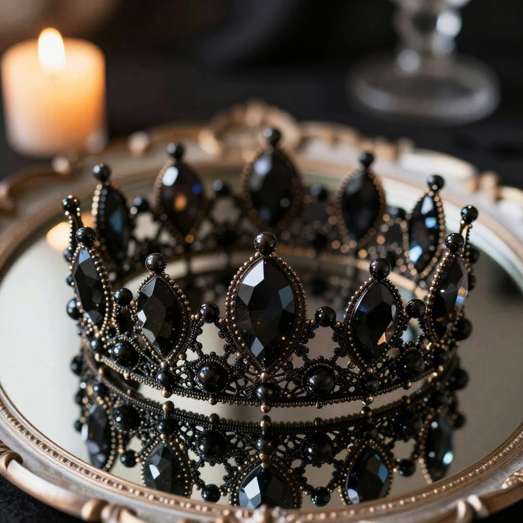 Close-up of a black tiara crafted from onyx and jet crystals, glimmering under soft candlelight, delicate lace-like metalwork intertwined with tiny black pearls, elegantly resting on a vintage mirrored surface, evoking a dark romantic fantasy theme.