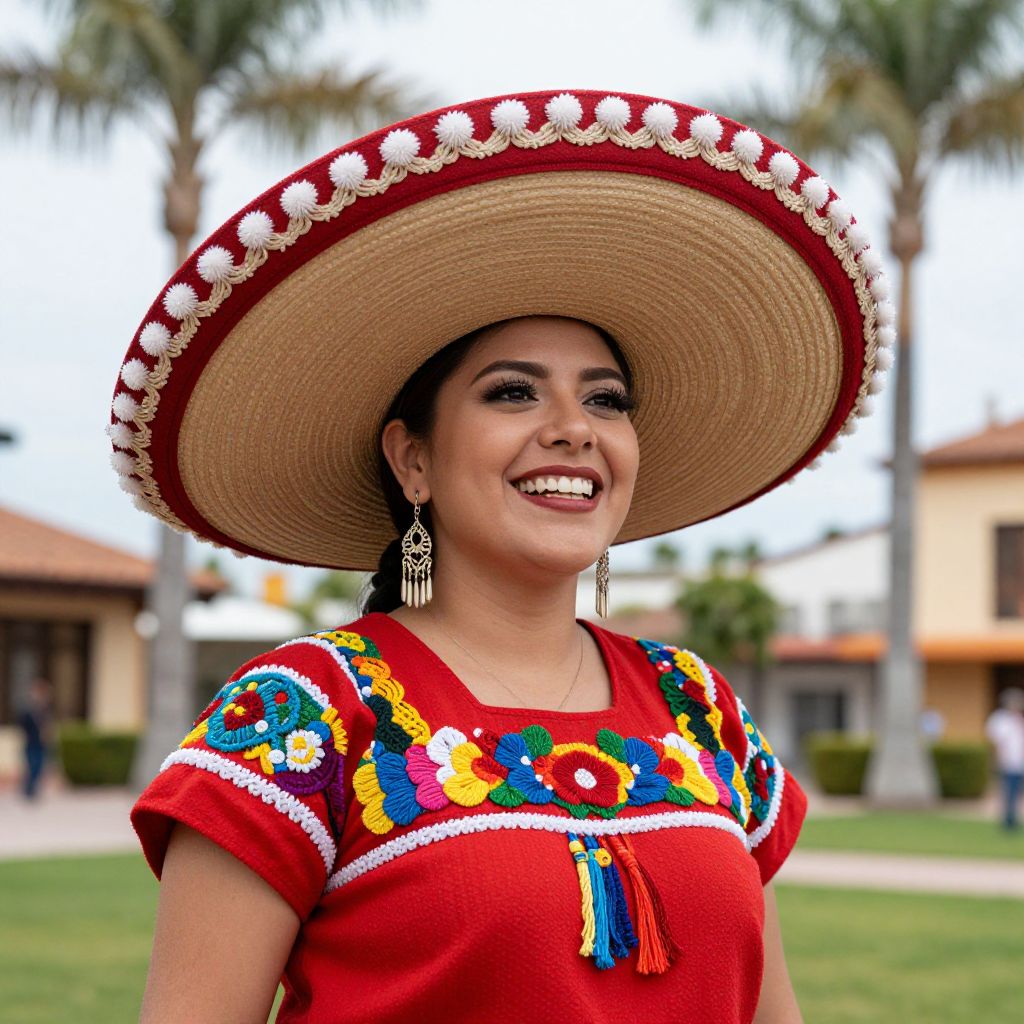 Woman wearing vibrant traditional Mexican attire, including a wide-brimmed sombrero adorned with white pom-poms, a red blouse with colorful embroidered patterns, and dangling earrings, smiles joyfully outdoors against a backdrop of palm trees and buildings.