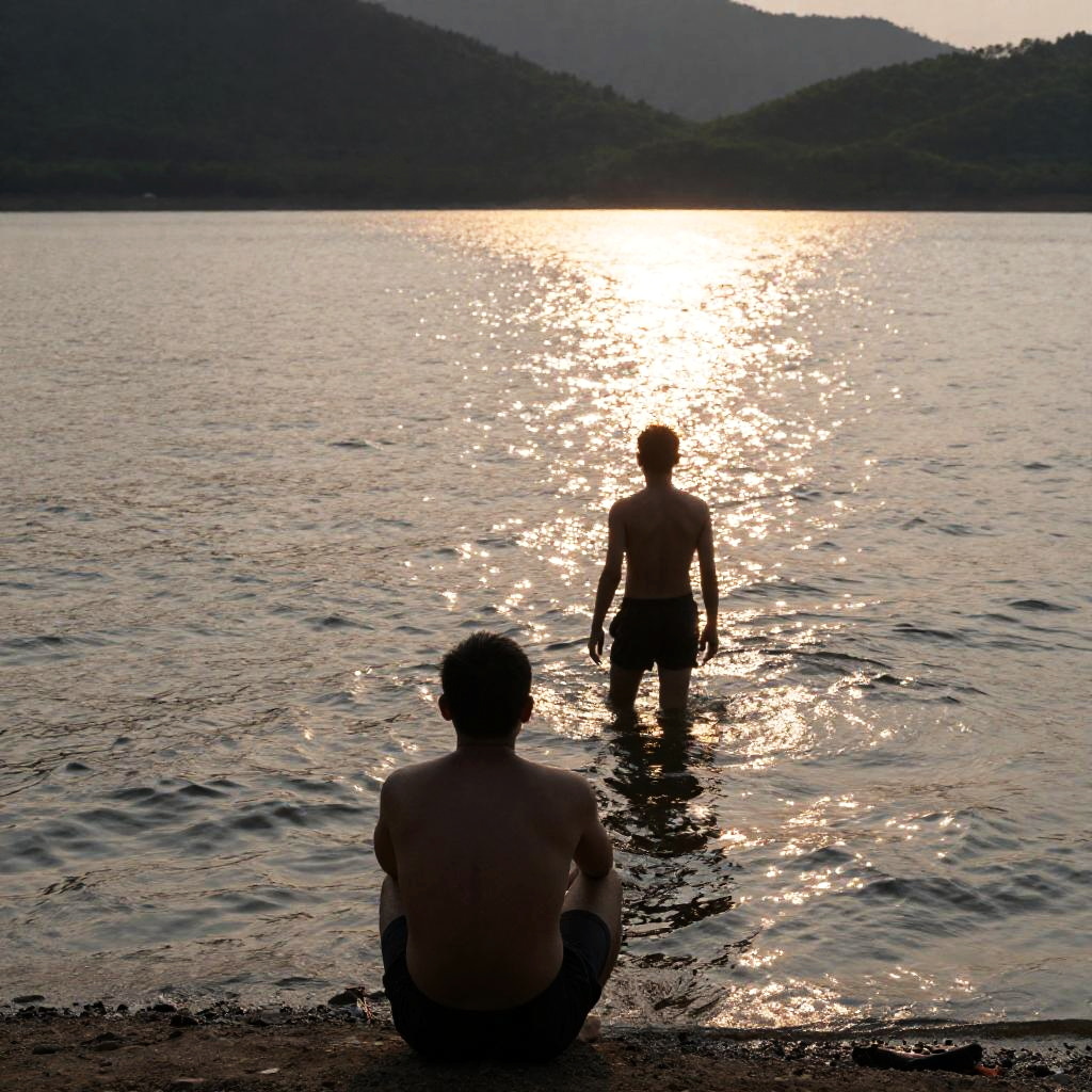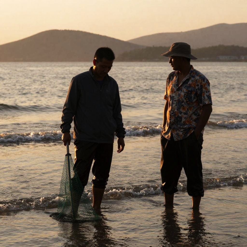 Photograph of two men standing in shallow water at sunset. Left man in gray jacket, dark pants, holding fishing net. Right man in floral shirt, hat, hands in pockets. Golden sunlight, gentle waves, distant hills in background. Both silhouetted.