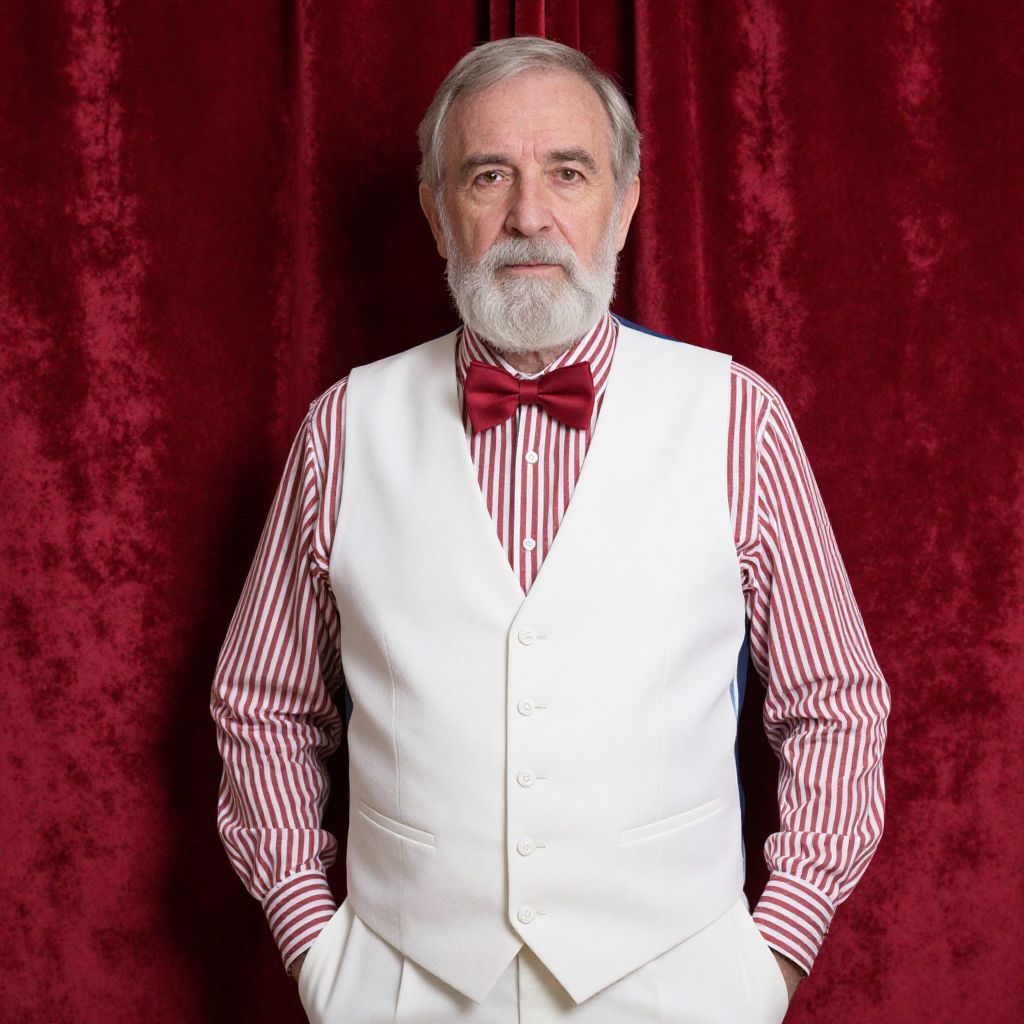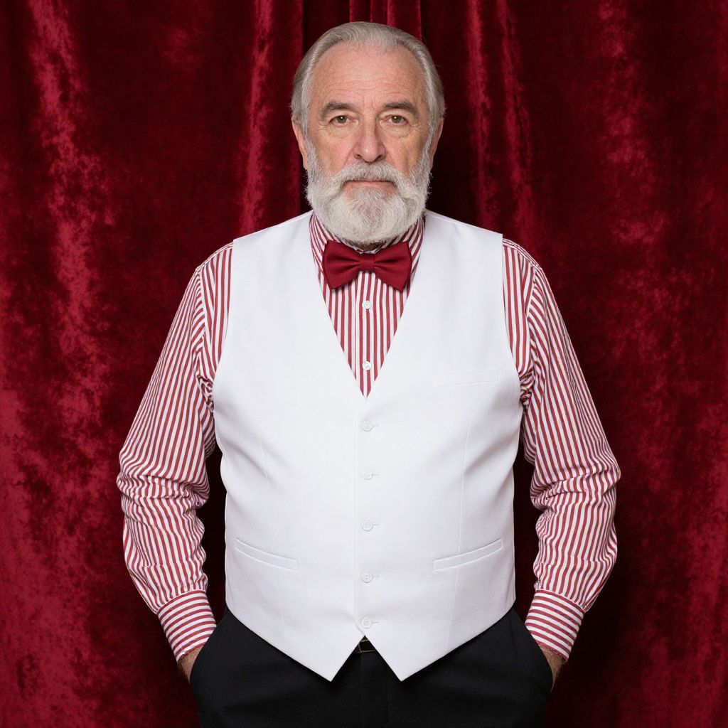 This is a photograph of an older man with a white beard and mustache, wearing a white vest over a red and white striped shirt, and a red bow tie. He stands with his hands in his pockets, looking straight at the camera. The background is a rich, red velvet curtain, adding a luxurious feel to the image. The man's expression is calm and composed.