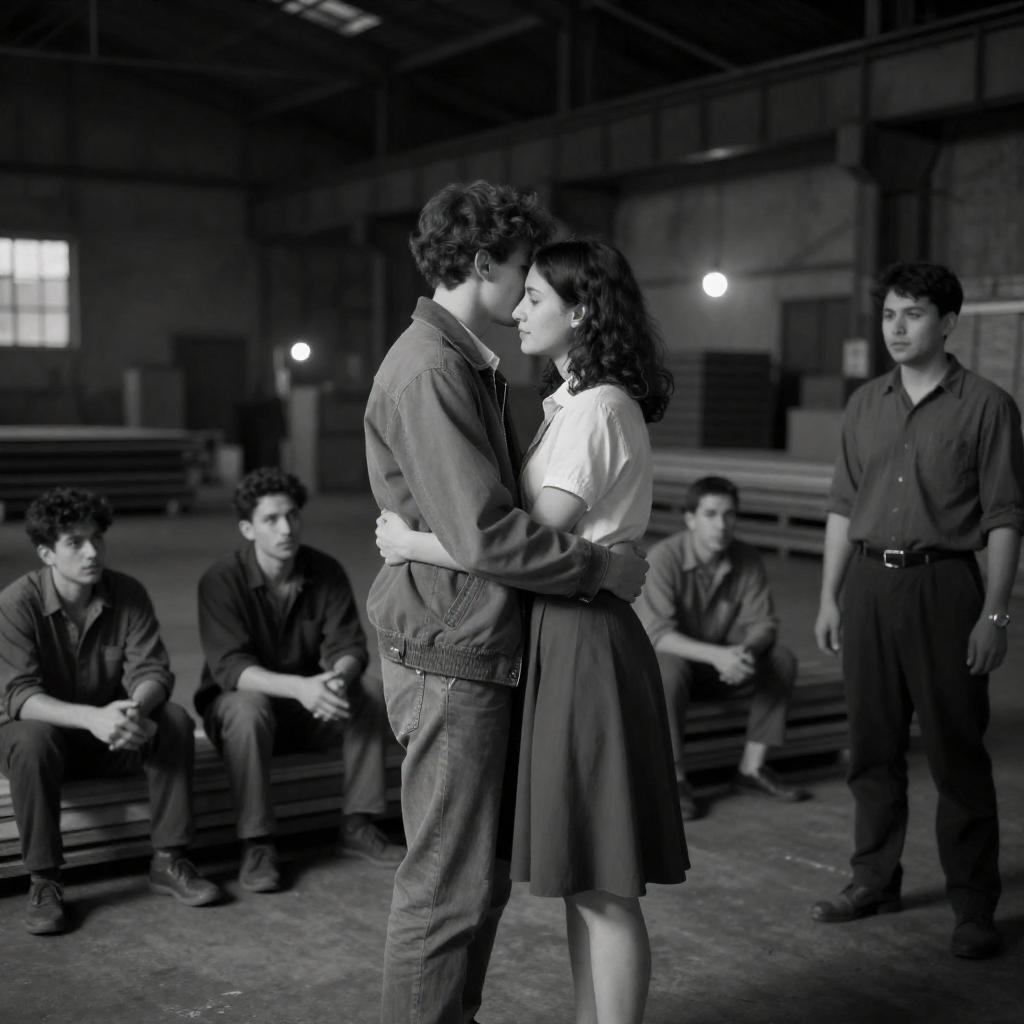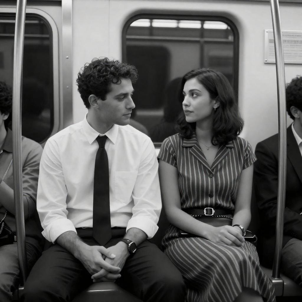 Black-and-white photograph of a man and woman sitting in a subway car. The man, with short curly hair and wearing a white shirt and black tie, looks down at his hands. The woman, with shoulder-length hair, wears a striped dress and gazes at him. Other passengers sit in the background, illuminated by overhead lights.