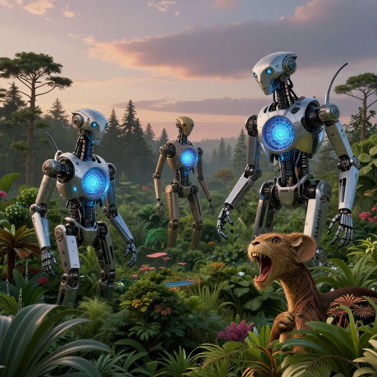 Fusiona-inspired surreal landscape depicting a harmonious blend of technology and nature, where mechanical creatures with glowing fusion cores coexist with lush forests under a twilight sky, intricate details highlighting the seamless integration of synthetic and organic life forms.