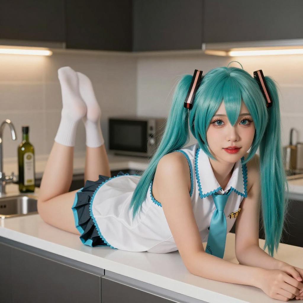 A digital artwork of a woman with turquoise hair and white accessories, kneeling on a kitchen counter. She wears white lingerie and socks, with her back arched and buttocks prominently displayed. A wooden countertop and a sink are in the background, with a warm light overhead.