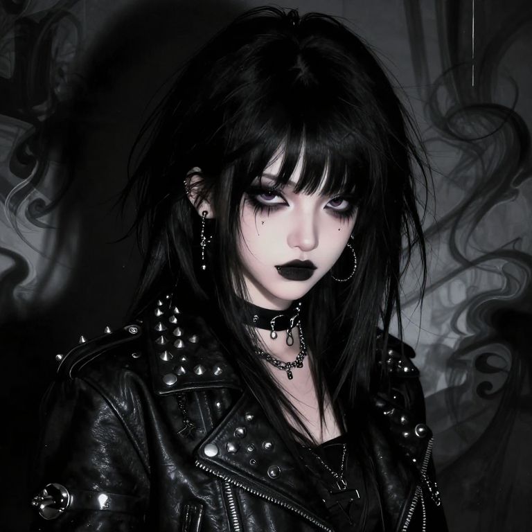 Portrait of a black hair emo girl with dramatic makeup and piercings, wearing a studded leather jacket, surrounded by swirling shadows and abstract dark patterns, intense eyes reflecting inner emotions, high contrast, artistic digital illustration.