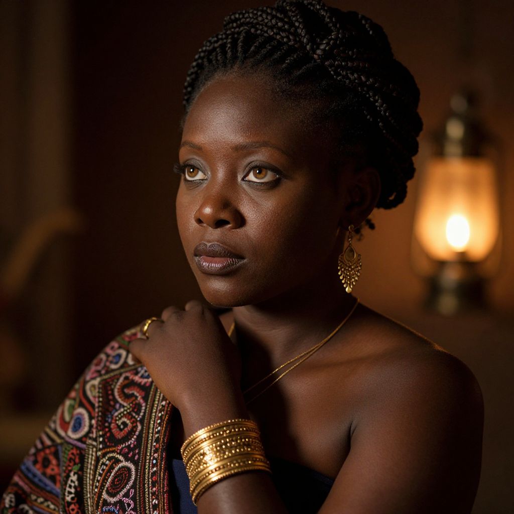 Photograph of a dark-skinned African woman with braided hair, wearing colorful traditional attire, gold jewelry, and looking contemplatively at a softly lit