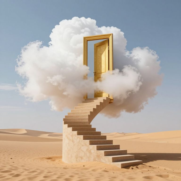 Digital artwork of a golden door framed by a fluffy white cloud, ascending a stone staircase in a sandy desert under a clear blue sky.
