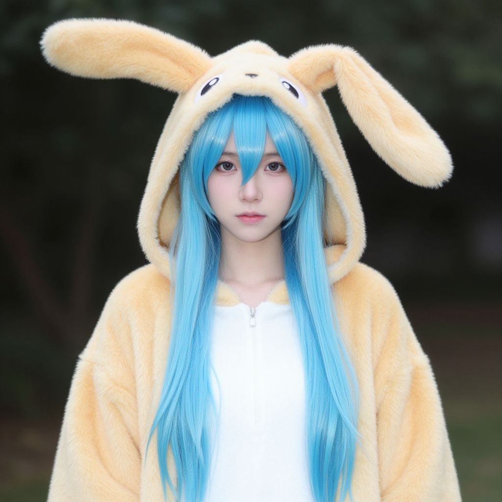 Pokemon misty costume, solo, cosplay, realistic, kigurumi, looking at viewer, closed mouth, 1boy, male focus, long hair, animal costume, rabbit costume, blue hair, hood