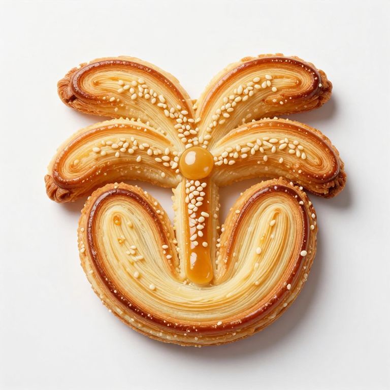 Artfully crafted Palmier pastries form a whimsical palm tree shape, featuring five golden-brown, flaky branches adorned with sesame seeds, converging at a round, glossy center, all resting on a pristine white surface.
