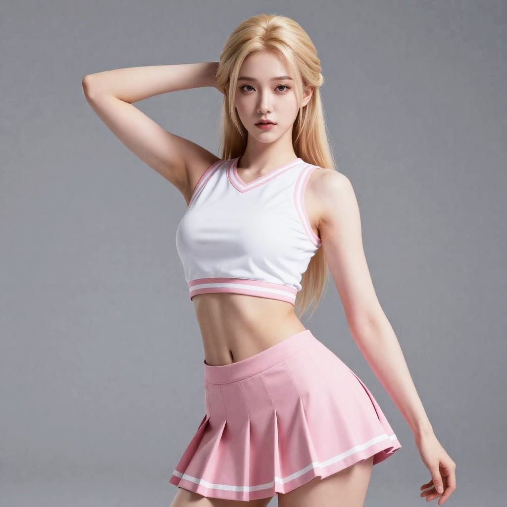 Ultrarealistic 8K image of a blonde woman with pale skin posing in a pink cheerleader outfit consisting of a sleeveless crop top and a pleated miniskirt. The model has a narrow waist and seductive posture, showcasing a clean and beautiful face with detailed facial features. The background is plain gray, emphasizing the figure and outfit.