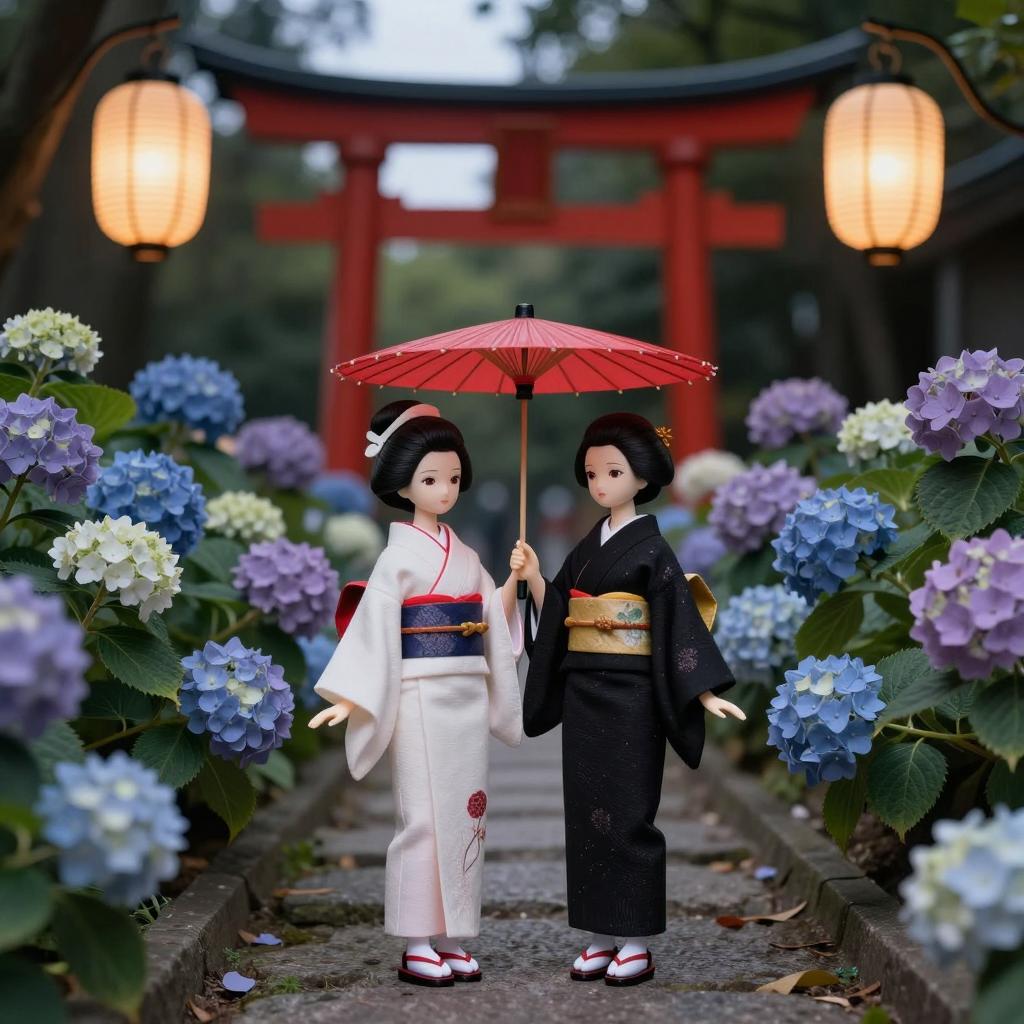 Photograph of two female dolls standing on a path lined with purple and white hydrangeas. They hold hands, one with a red parasol over her head. Lanterns hang from above. A torii gate is in the background. Dense green foliage surrounds the path. Blue twilight lighting. Dolls wear traditional Japanese clothing. One doll wears a white kimono with a headpiece, the other a black dress with a white collar. Dolls are centered in the foreground, lanterns and torii gate in the background.