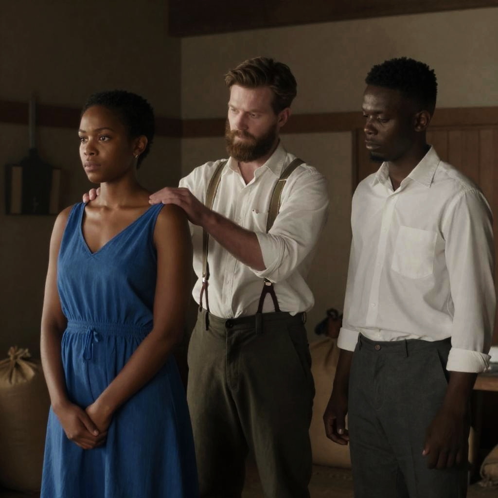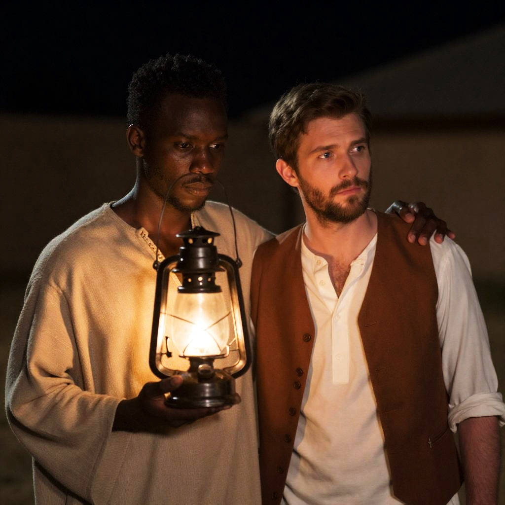 Photograph of two people at night. An African man with dark skin, short curly hair, and a beige robe holds a lit lantern close to his face. A white man with brown hair, beard, and a white shirt with brown vest stands beside him, looking to the right. Both have serious expressions. Background is dark with indistinct shapes. Man on the left's hand rests on the lantern's handle, and the man on the right's arm is around the other's shoulder.
