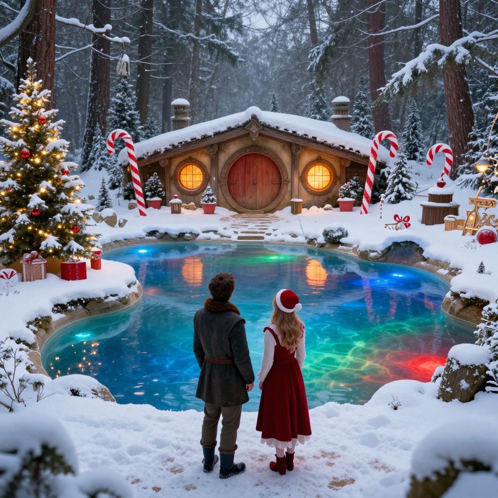 In this enchanting winter fairytale forest, a man and a woman stand in awe of the vibrant, magical pools of water that shimmer with hues of blue, green, and red. The scene is adorned with Christmas decorations, including twinkling lights, candy canes, and a Christmas tree, creating a festive atmosphere. The hobbit house, with its round doors and windows, stands as a charming centerpiece, illuminated by warm, inviting lights. The forest is blanketed in a layer of pristine white snow, adding to the enchantment. The overall composition is a harmonious blend of colors, textures, and shapes, with the man and woman positioned in the foreground, appearing to be in a state of wonder as they gaze upon the enchanting scene. The image captures the essence of a magical, whimsical world, where the boundaries between fantasy and reality blur, creating a captivating and serene atmosphere.