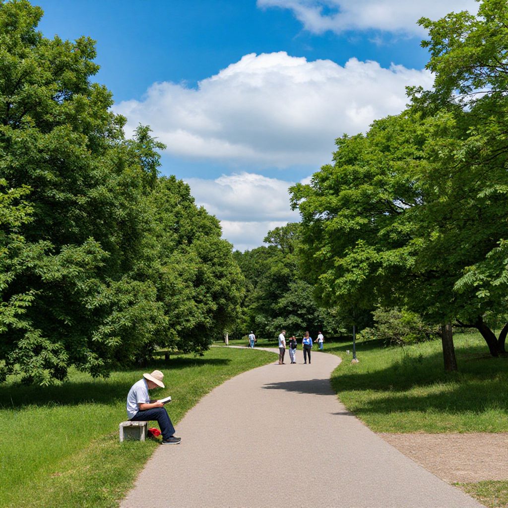 Lush green trees frame a serene park scene where a man in a wide-brimmed hat sits reading by a winding path, while two figures converse further down the road under a vibrant blue sky dotted with fluffy clouds.