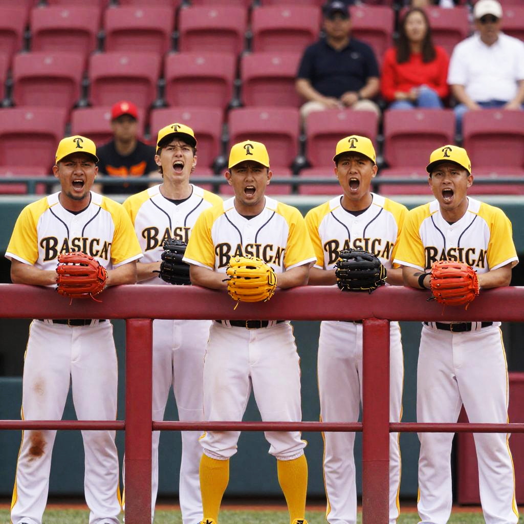 Photograph of a line of young baseball players in white uniforms and yellow helmets, standing on a baseball field. Their expressions are serious. An older man in a blue shirt stands behind them. Background includes a chain-link fence and blurred spectators. The players hold their helmets in front of them. Nine players visible.