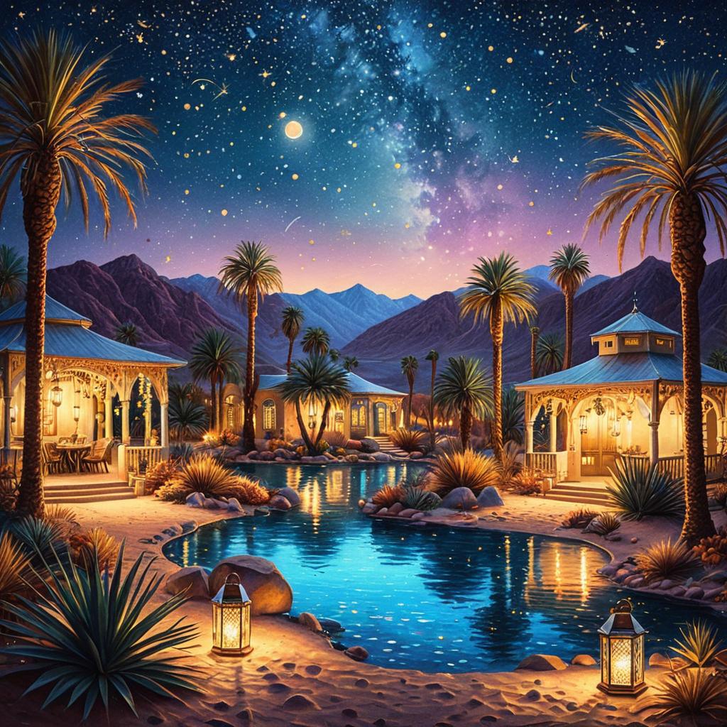 Metallic pastel tones, tranquil desert oasis with palm trees and sparkling water, autumn theme, night sky full of stars, glowing lanterns, in the style of Mandy Jurgens, Thomas Kinkade, Camilla d’Errico. Photorealistic, hyper-detailed, epic light, golden sparkling lights.