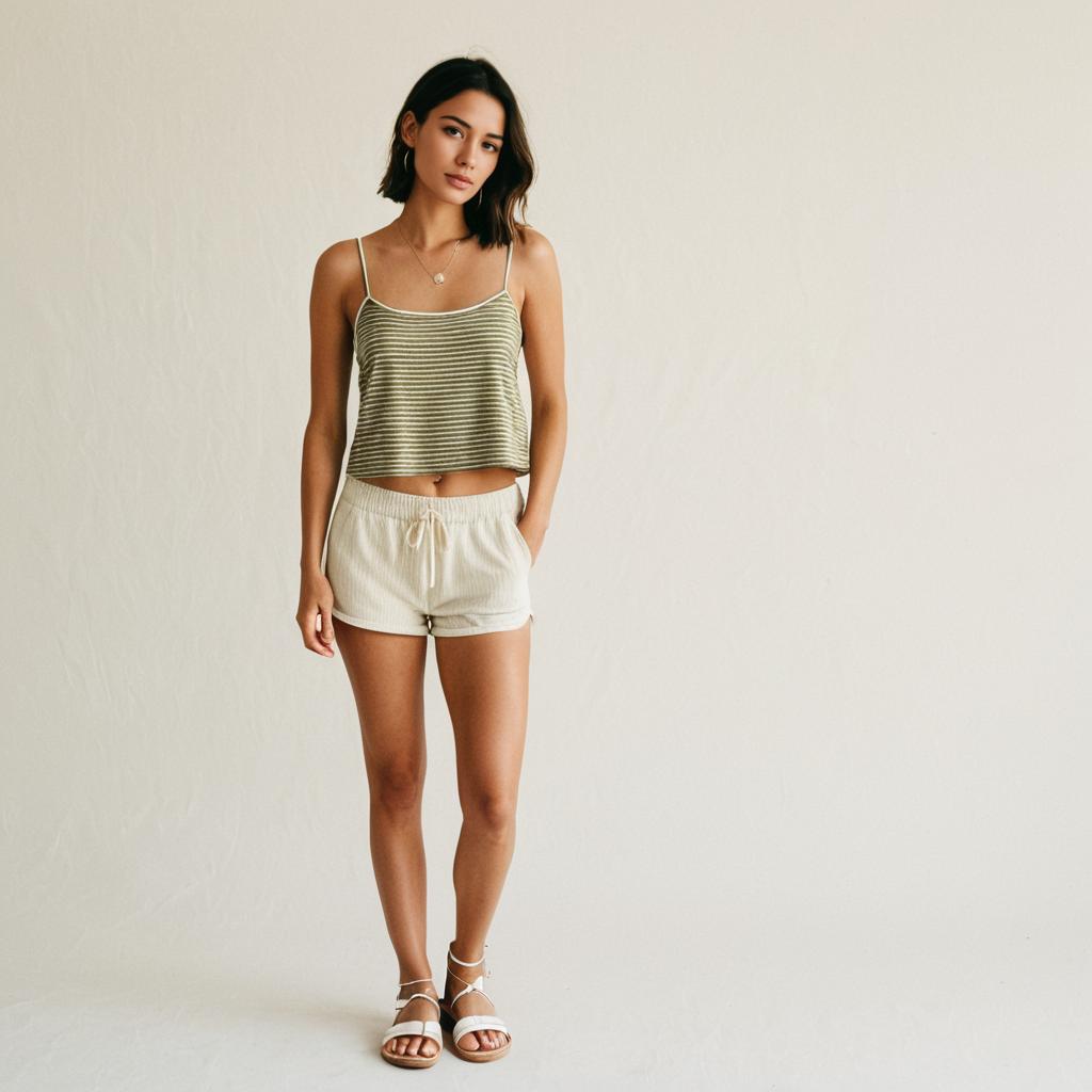 Woman, casual summer, cropped tank top in horizontal olive green stripes, scoop neckline, thin straps, paired with off-white high-waisted drawstring shorts, soft cotton material, relaxed fit. Flat strappy sandals in a light tan color, minimal jewelry, studio background with a white seamless backdrop.
