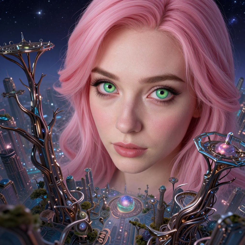 Craft an enigmatic digital art portrait of a young woman with shimmering silver tresses falling past her shoulders, invoking the whimsical essence of melting clocks. The backdrop showcases a surreal cityscape where buildings warp into inconceivable forms, stirring emotions of bewilderment and fascination. An otherworldly moon bathes the scene in an ethereal glow, casting mystical shadows that envelop the landscape with enigma and curiosity. Seen from a low vantage point, viewers are drawn to her captivating green eyes as she appears to gaze directly at them from within this fantastical realm.