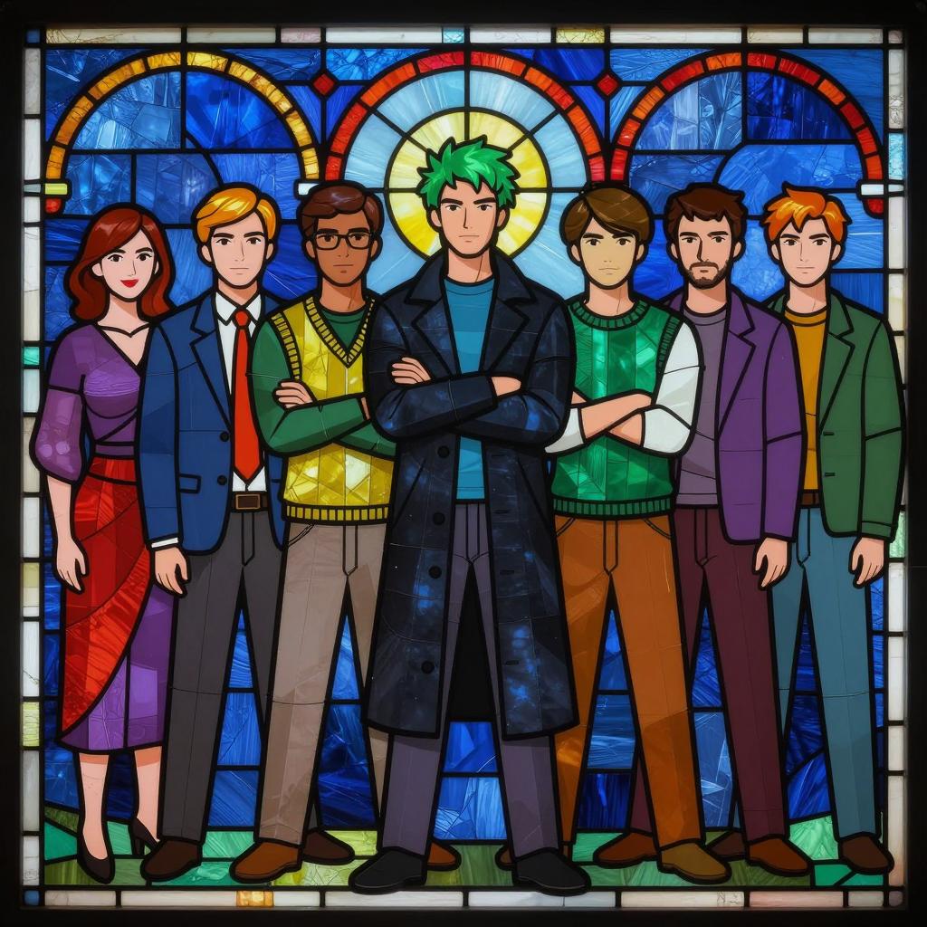 Stained glass illustration of seven people standing in a row. Central male with green hair and black coat, halo above head. Five males and two females, varied colorful clothing. Blue background with arches. Smiling female on left, serious male on right. Arms crossed by two males in middle. Bright colors, bold outlines.
