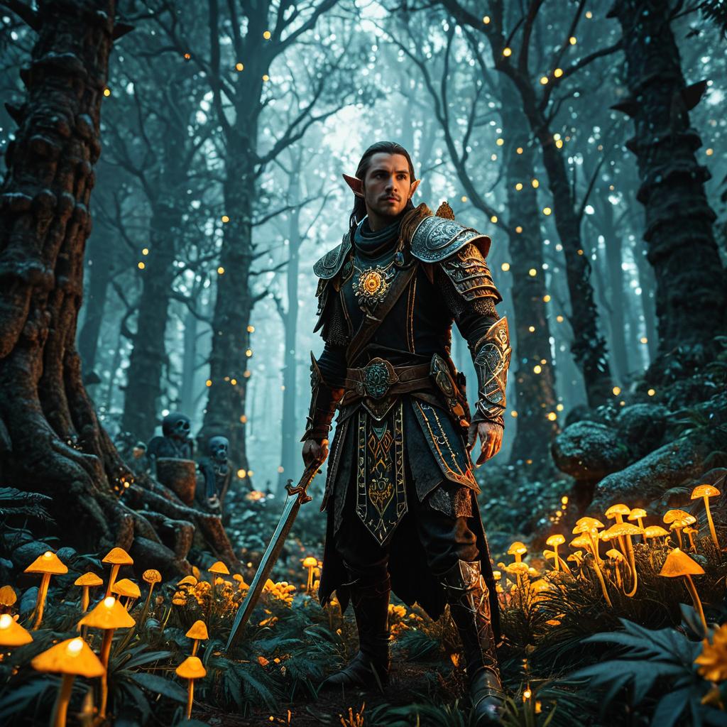 Heroic portrait of ancient elven ranger with glowing runes on armor exploring overgrown enchanted forest under a twilight sky, rendered with dramatic chiaroscuro and moody colors, painterly technique inspired by Brom, hyper-detailed cinematic concept art.