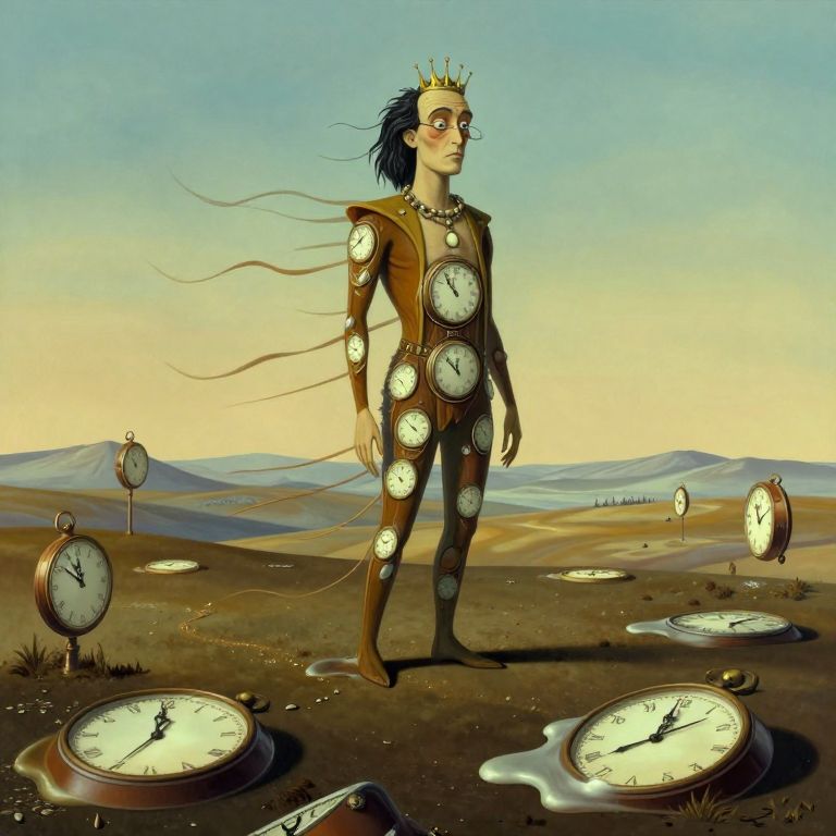 In this surreal landscape, a regal creature stands tall upon a windswept hill, its form composed of fluid timepieces that sway with each gentle breath. The scene evokes the dreamlike quality of Salvador Dali's iconic works, as melting clock faces are scattered across the barren terrain, their colors merging to create a harmonious yet disquieting palette. Soft light bathes the otherworldly tableau, casting long shadows that stretch like liquid ribbons, emphasizing the fantastical blend of elements in this serene yet challenging vision of reality.
