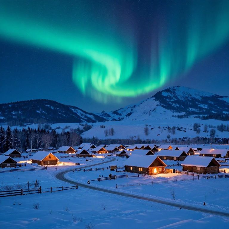 Photograph of a snowy village at night, illuminated by vibrant green Northern Lights in the dark blue sky. Wooden cabins with warm yellow lights are scattered across a snow-covered landscape, surrounded by wooden fences and snow-covered paths. A winding road cuts through the foreground, leading to the village. In the background, snow-covered hills and sparse trees create a serene, wintry atmosphere. The Northern Lights arc gracefully above the hills, contrasting with the dark, starless sky.