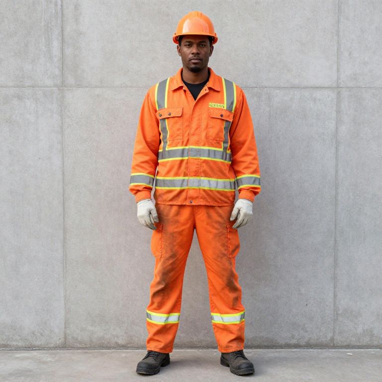 "September Work Outfit, construction worker in orange safety gear standing in front of a wall"
