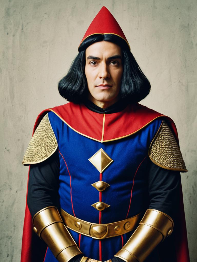 Photorealistic editorial portrait of a man dressed as Lord Farquaad from the Shrek series. The costume features a red crown with gold accents, a blue tunic with gold trim, red and green long sleeves, and a red cape. The man has medium-length black hair styled in a bob cut and a serious expression.