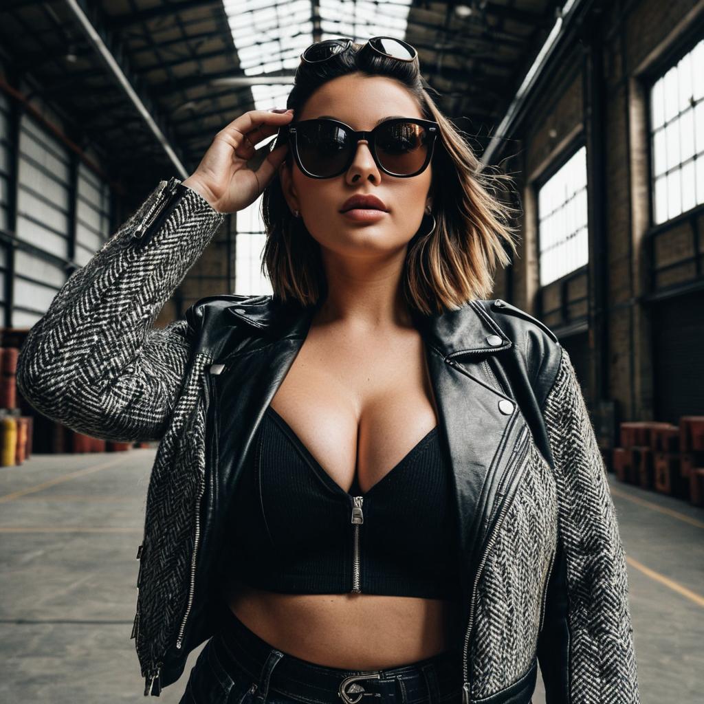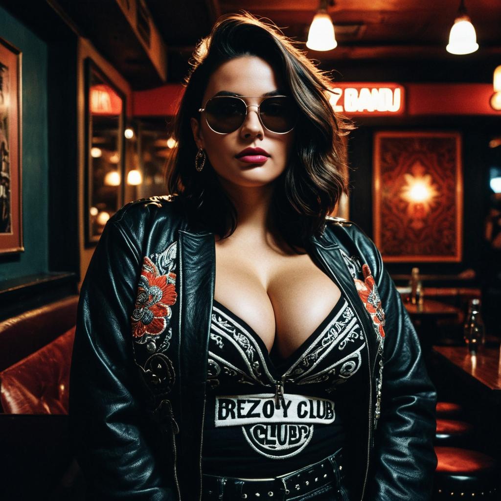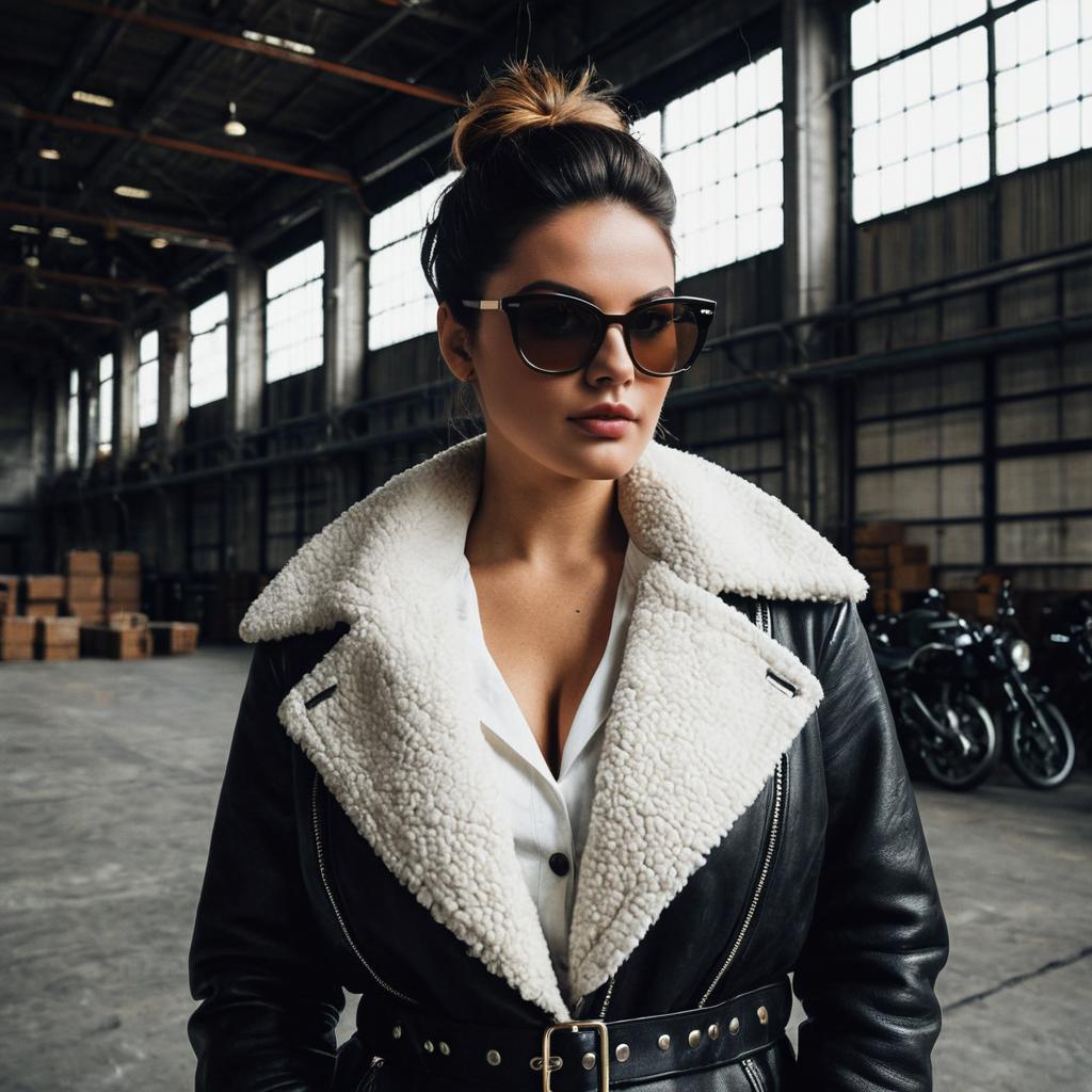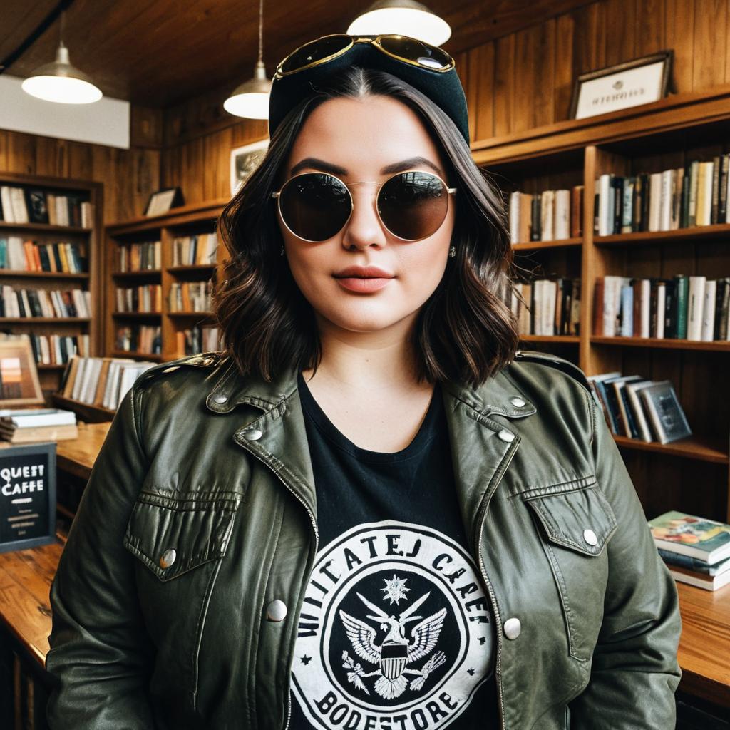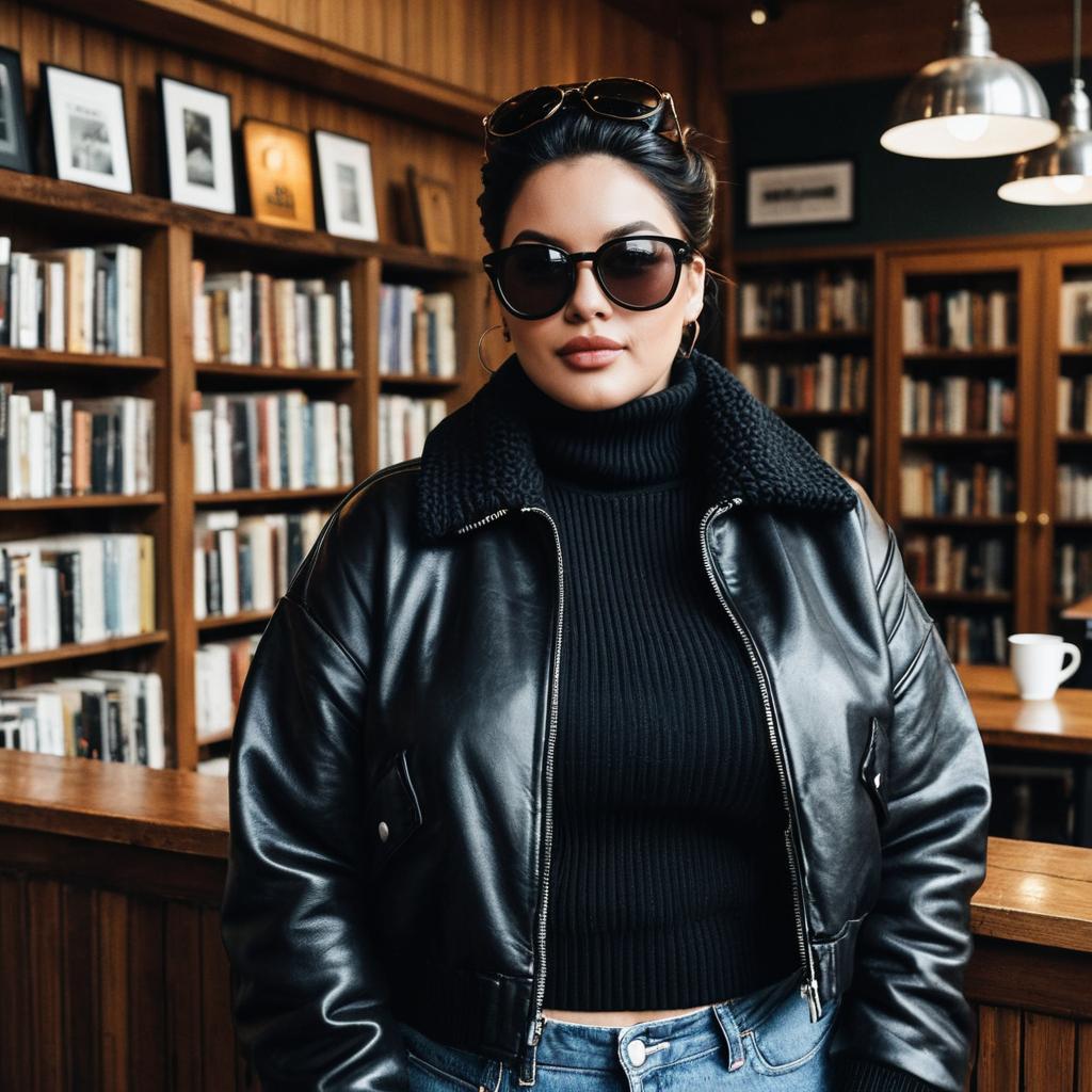 Leather Jacket Street Style, waist-up portrait of a curvy woman posing indoors with large sunglasses pushed up on her head. She wears a vintage band t-shirt and a long black trench coat, open. The background features vintage American diner counter with neon signs. Edgy chic, photorealistic, beautiful eyes