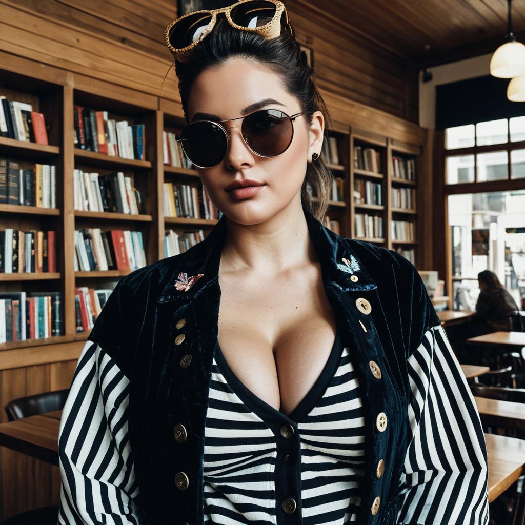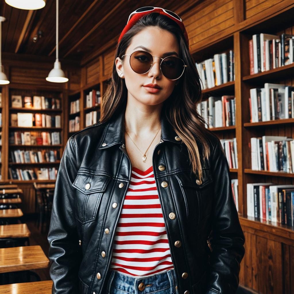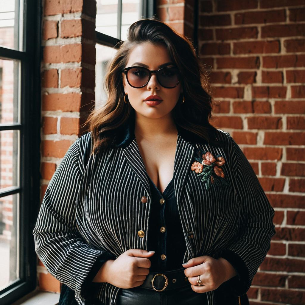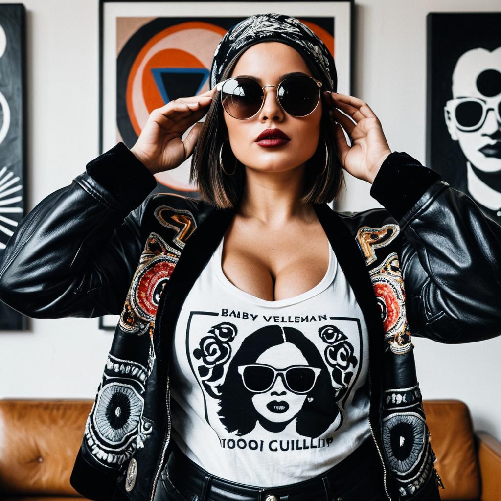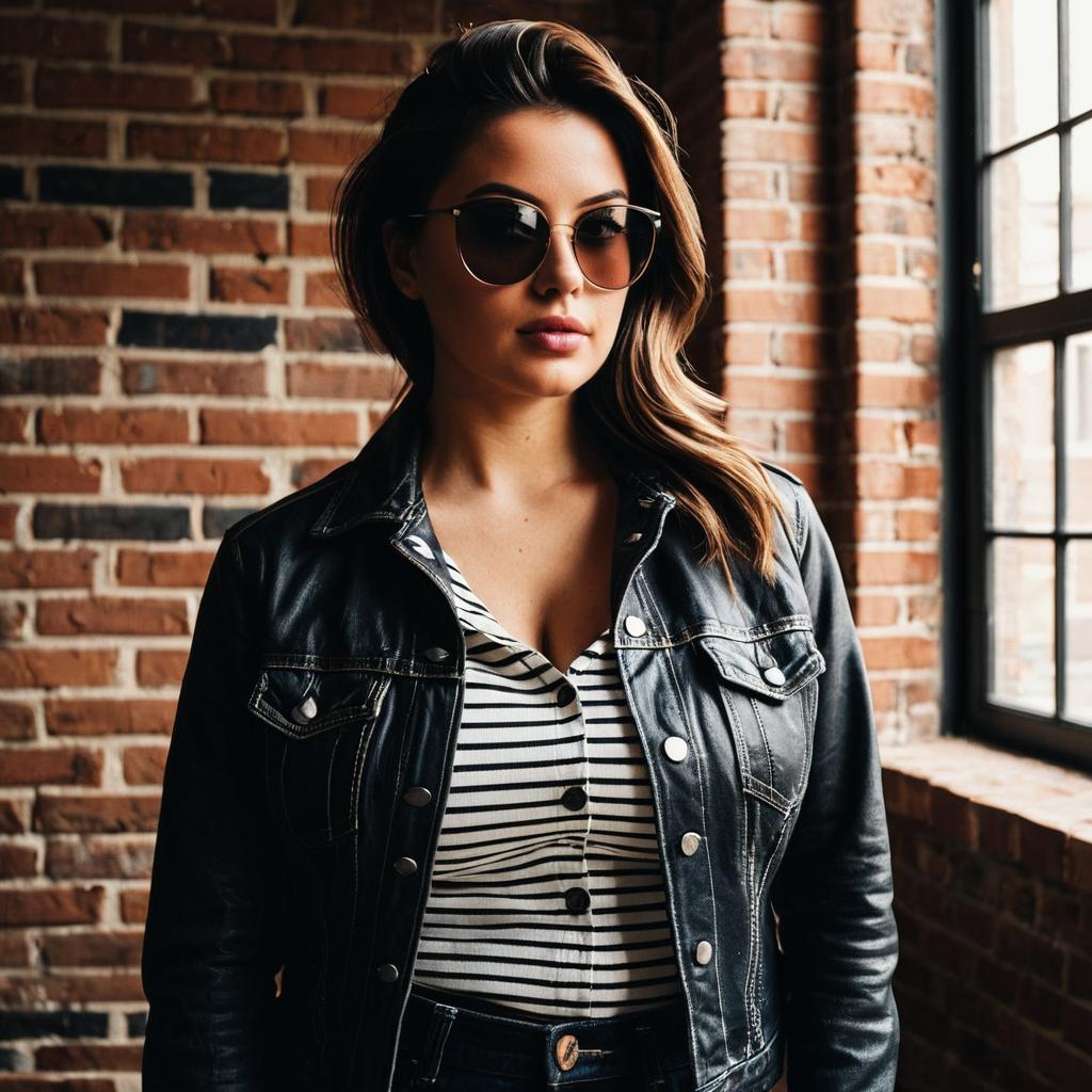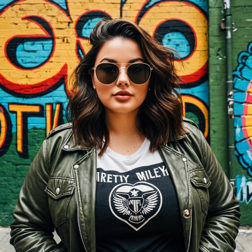 Leather Jacket Street Style, waist-up portrait of a curvy woman posing indoors with large sunglasses pushed up on her head. She wears a vintage band t-shirt and a long black trench coat, open. The background features vintage American diner counter with neon signs. Edgy chic, photorealistic, beautiful eyes