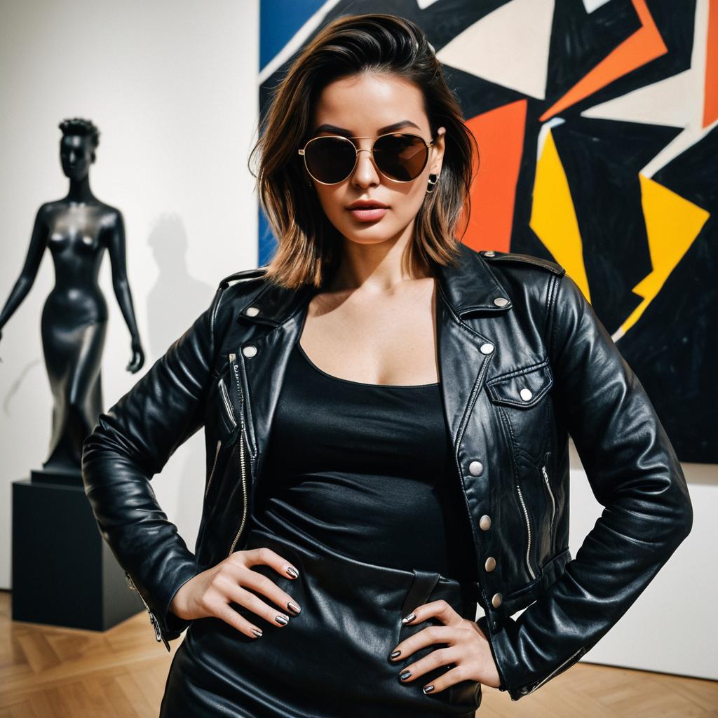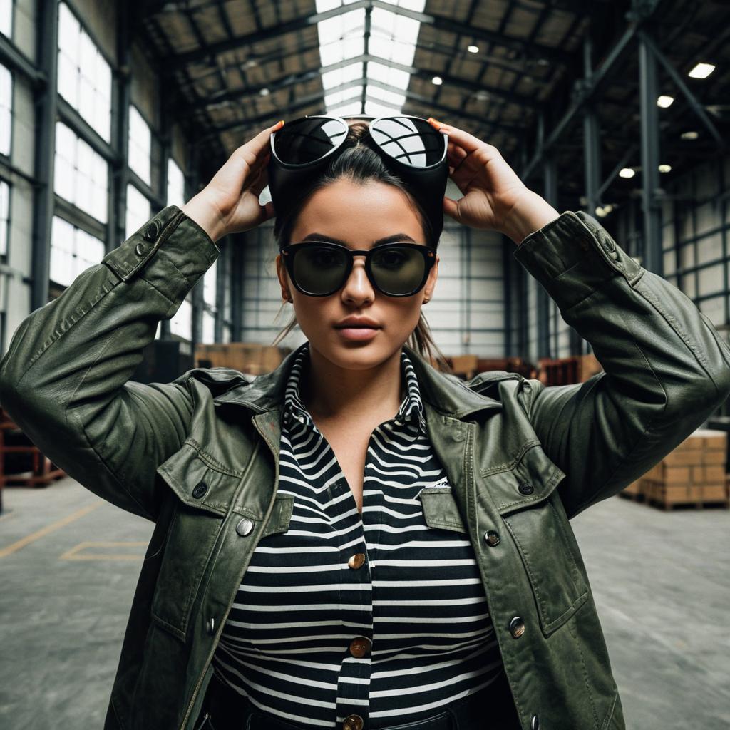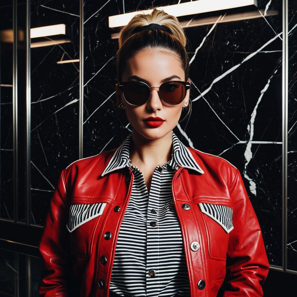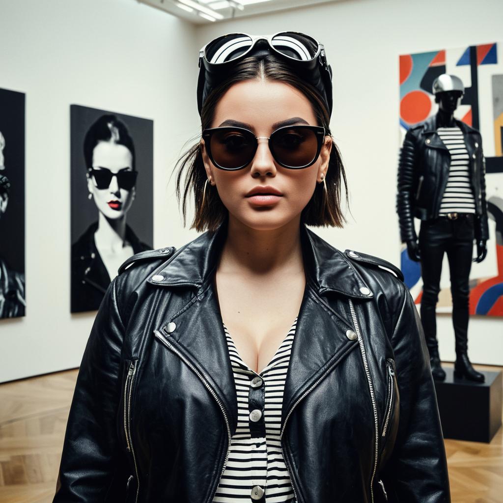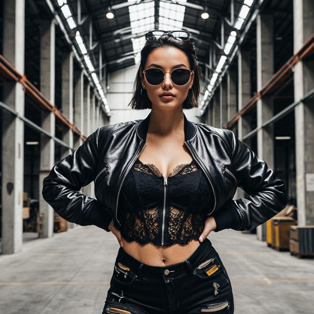 Leather Jacket Street Style, waist-up portrait of a curvy woman posing indoors with large sunglasses pushed up on her head. She wears a vintage band t-shirt and a long black trench coat, open. The background features vintage American diner counter with neon signs. Edgy chic, photorealistic, beautiful eyes