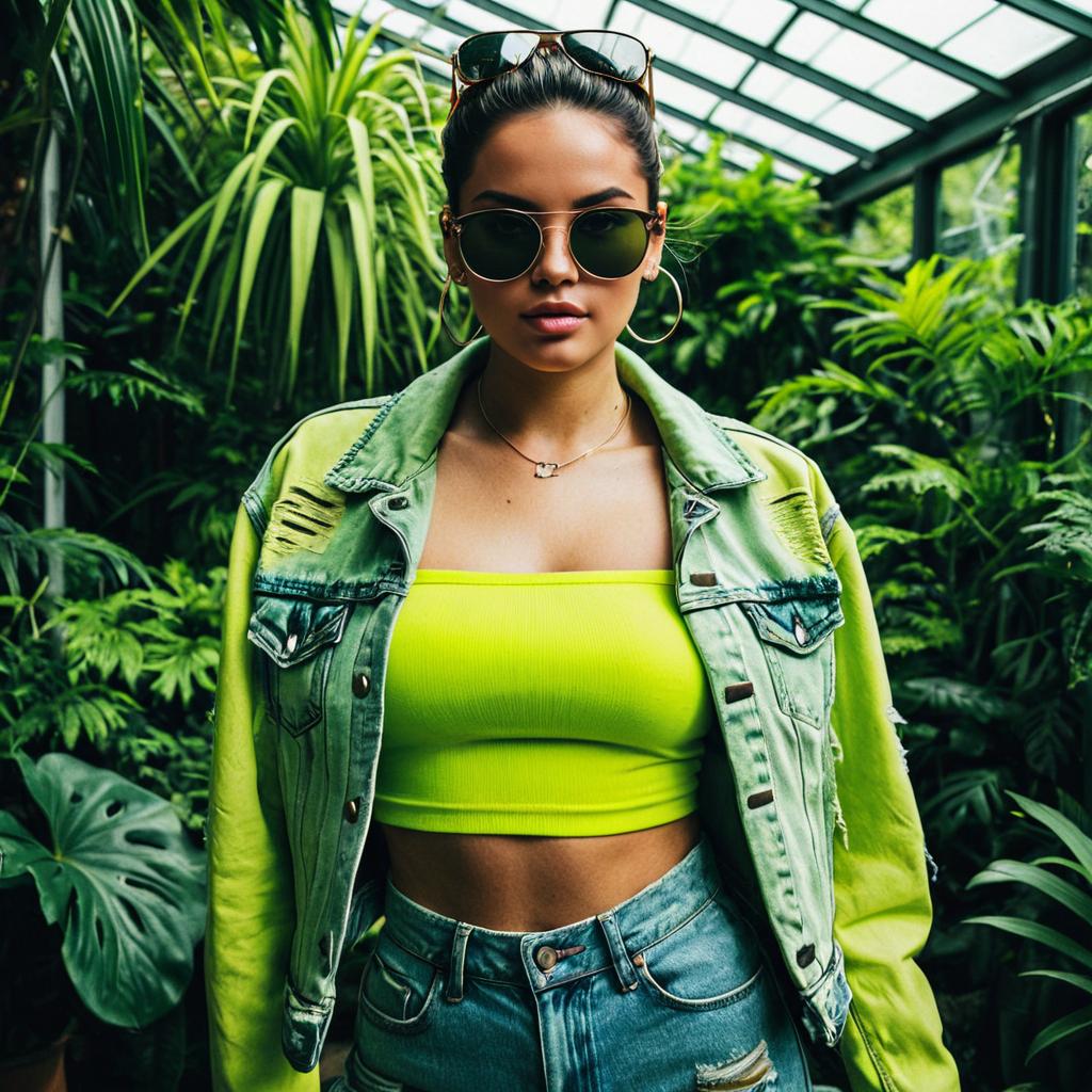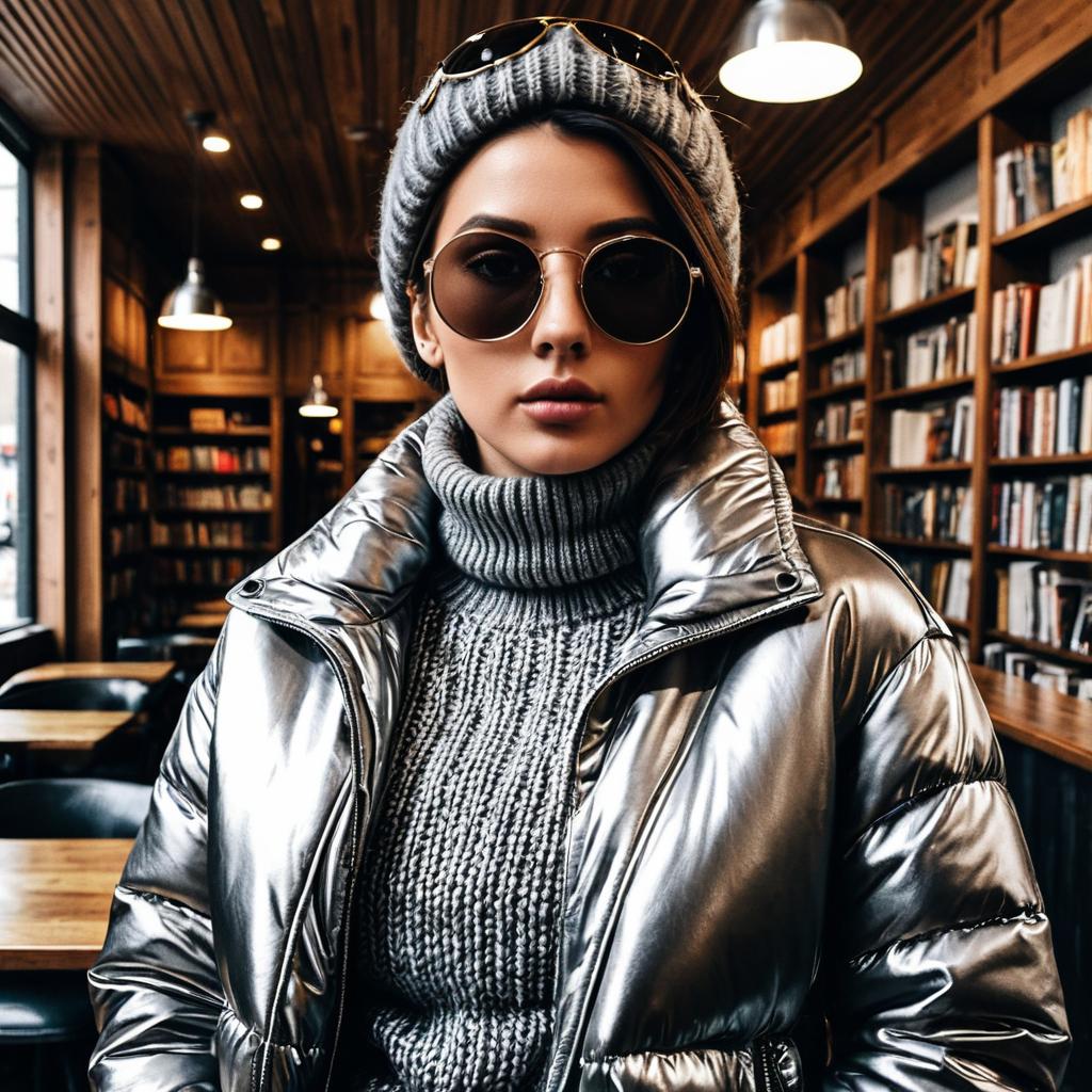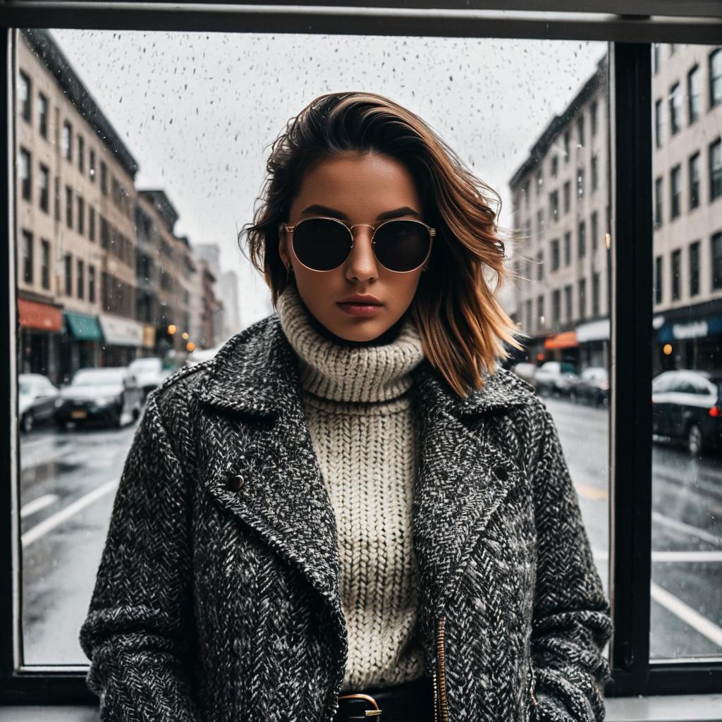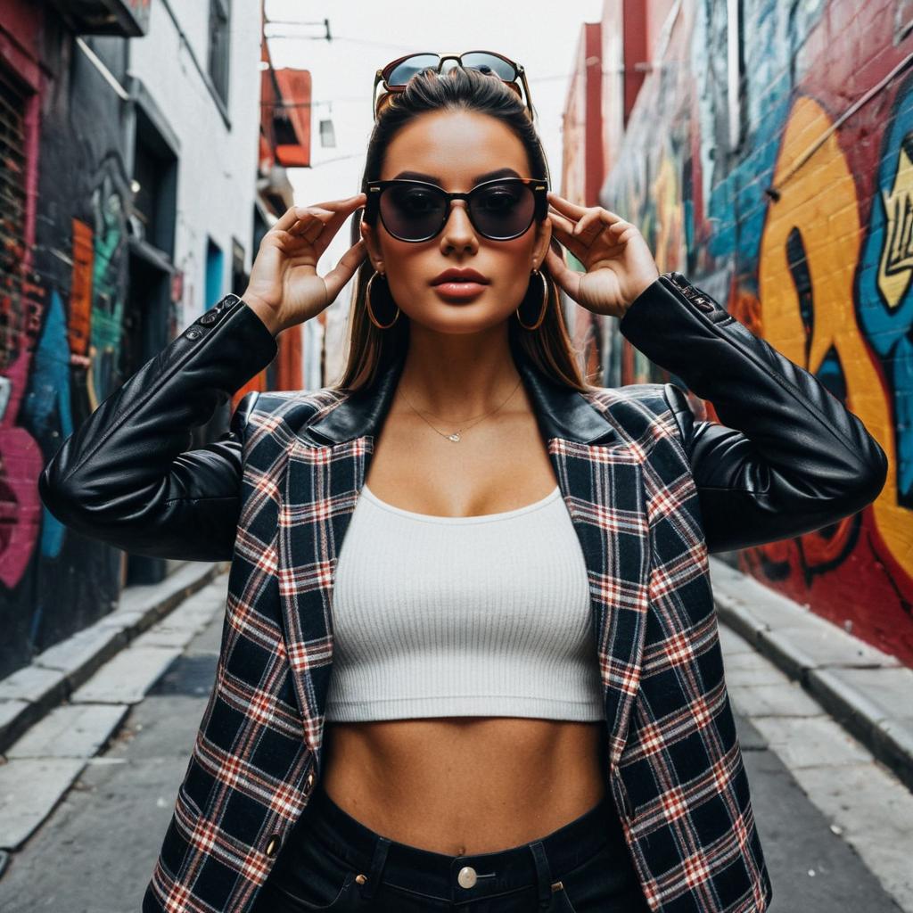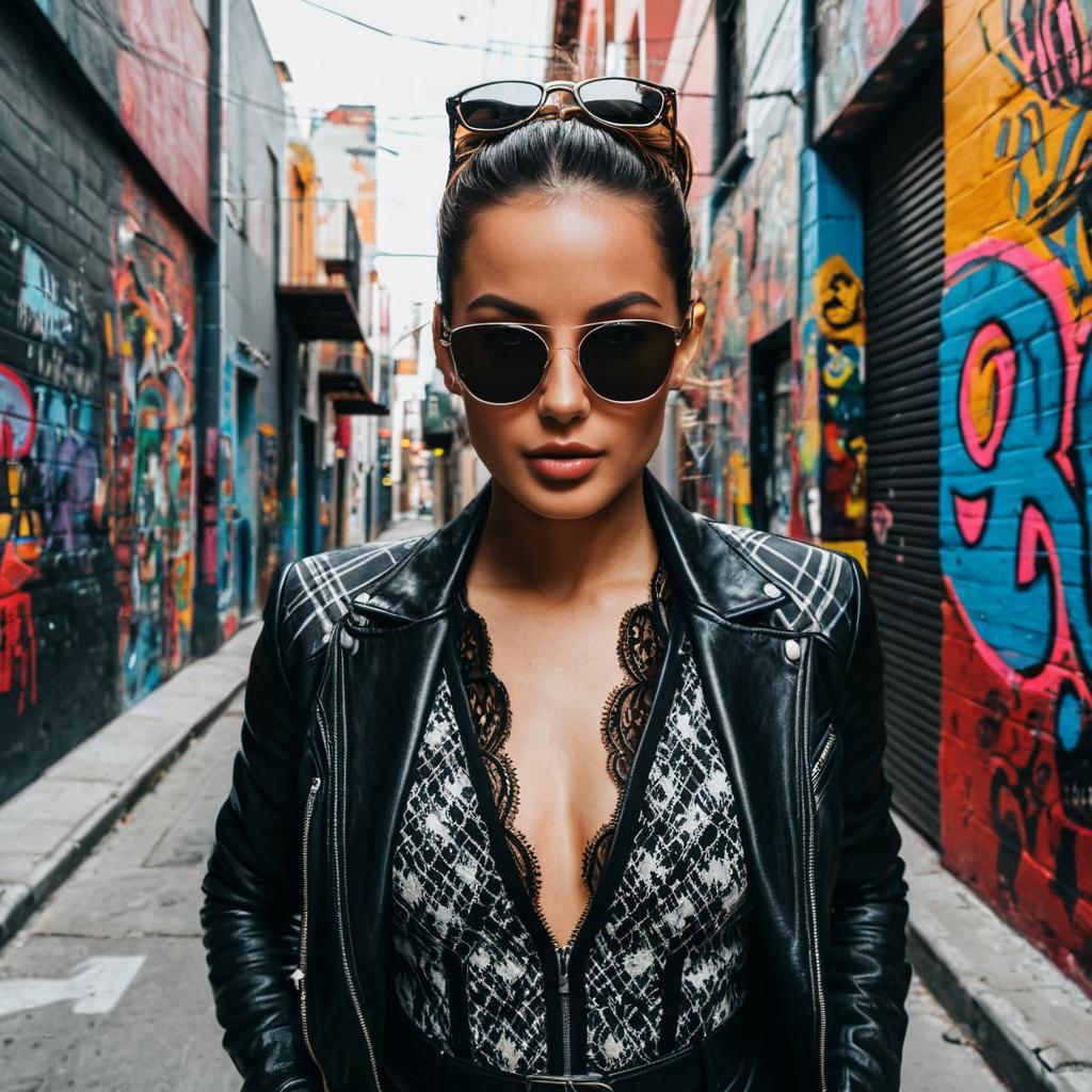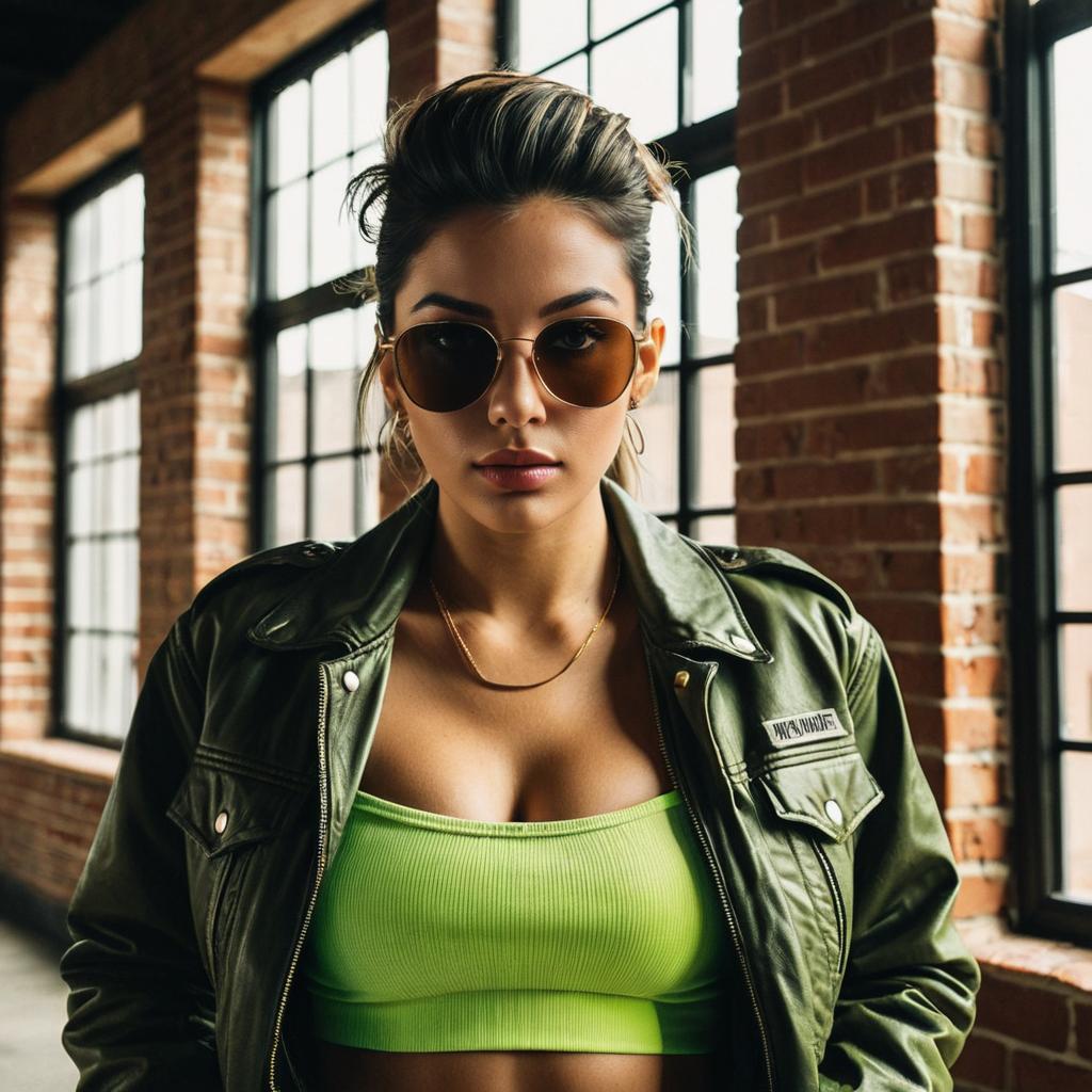 Leather Jacket Street Style, waist-up portrait of a curvy woman posing indoors with large sunglasses pushed up on her head. She wears a vintage band t-shirt and a long black trench coat, open. The background features vintage American diner counter with neon signs. Edgy chic, photorealistic, beautiful eyes