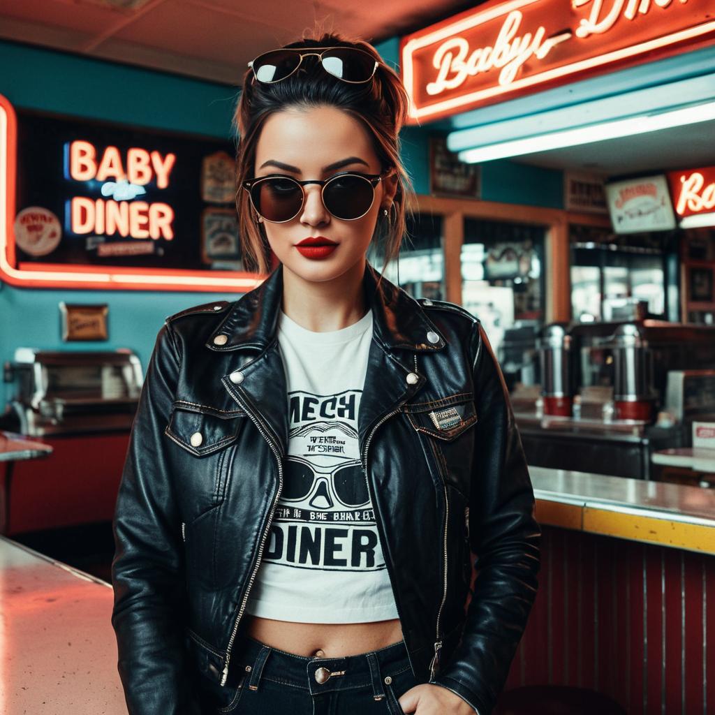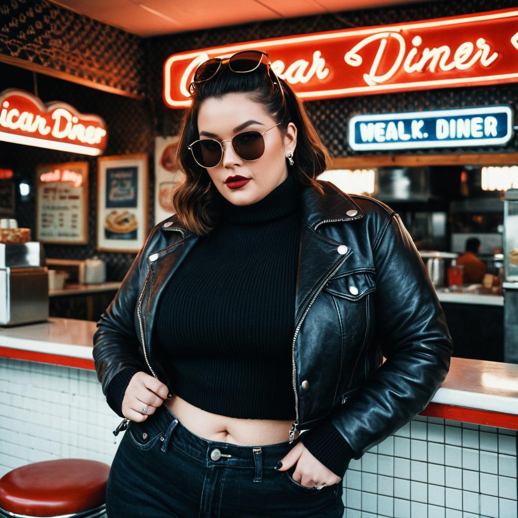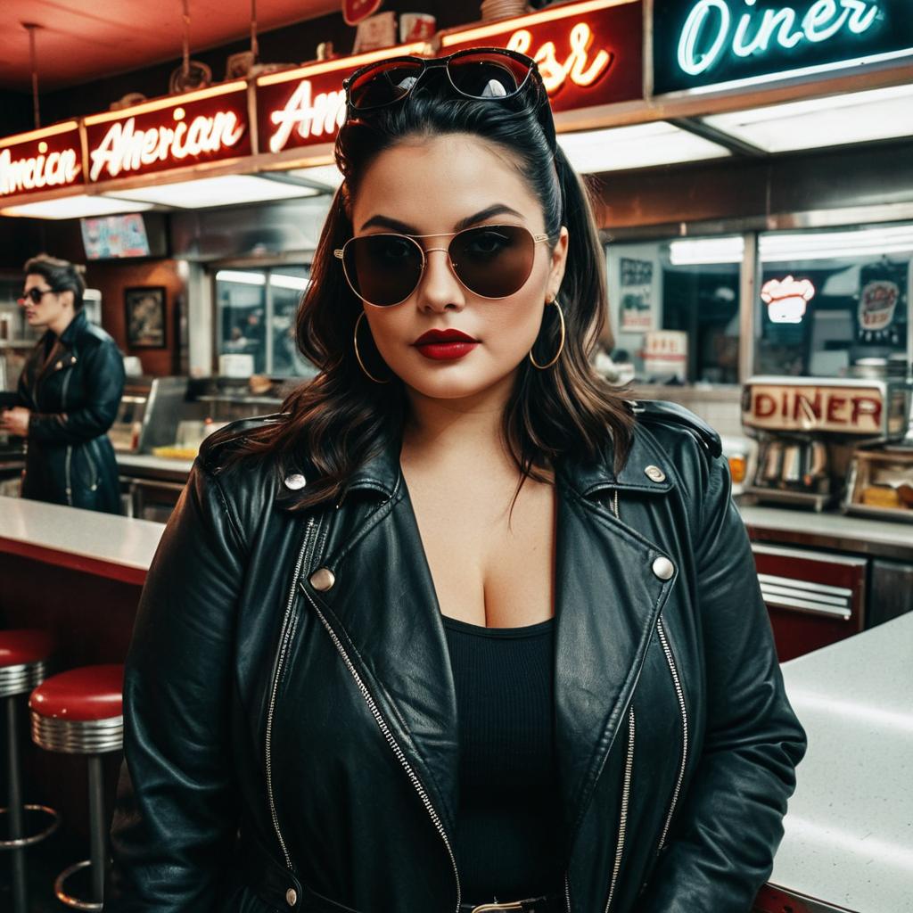 Waist-up portrait of a curvy woman with medium skin tone wearing a black leather jacket, black top, large hoop earrings, and oversized sunglasses pushed up on her head. She poses confidently inside a vintage American diner featuring neon signs and a classic diner interior with stools and a counter.