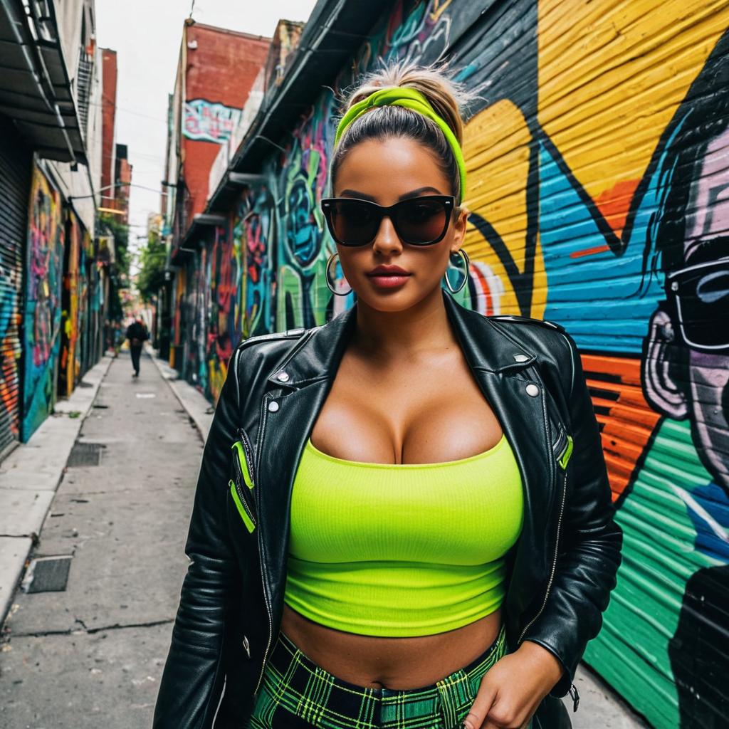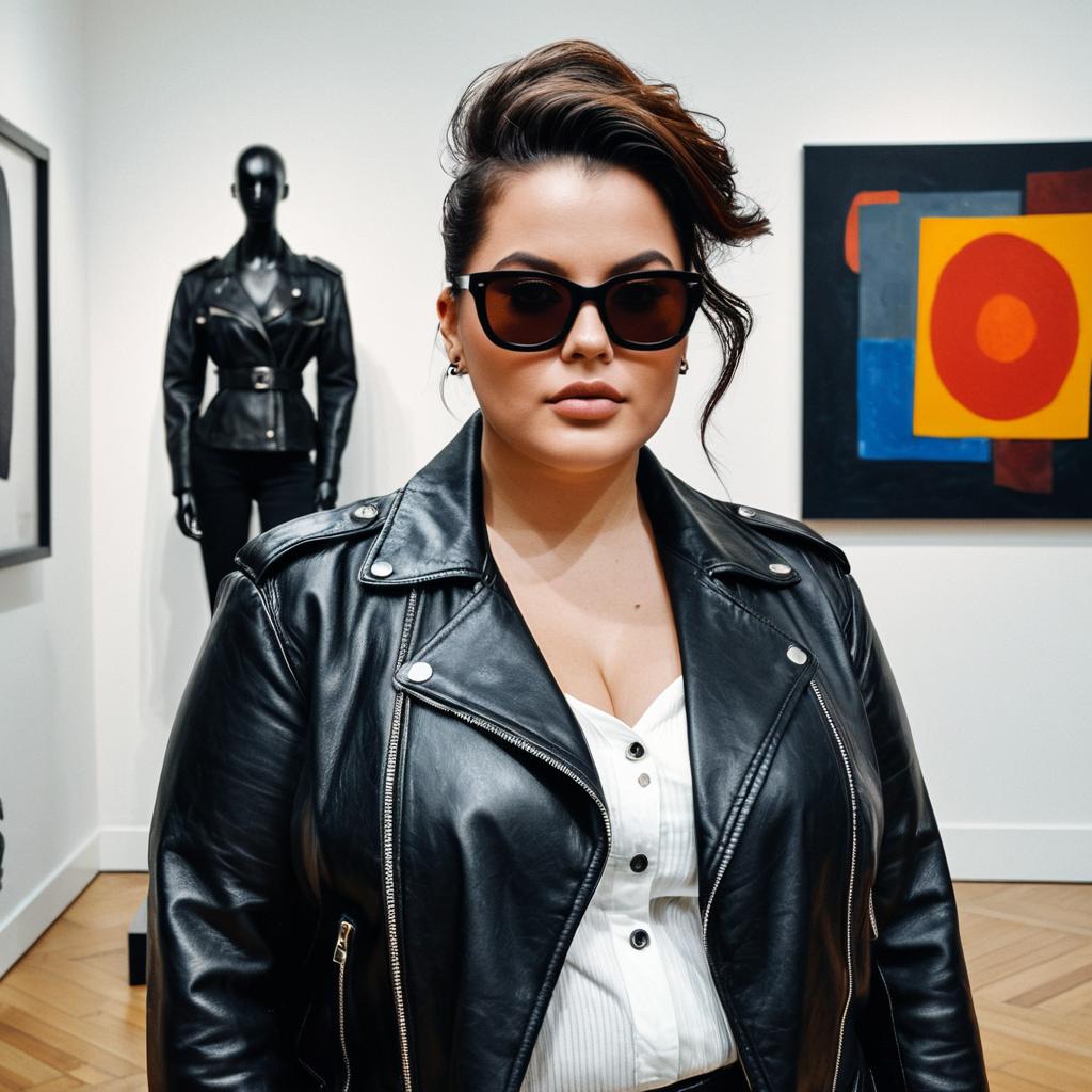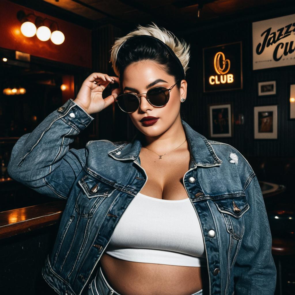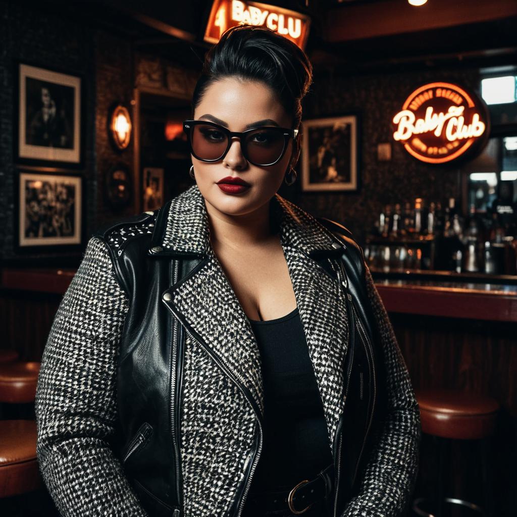 Waist-up portrait of a curvy woman with medium skin tone wearing a black leather jacket, black top, large hoop earrings, and oversized sunglasses pushed up on her head. She poses confidently inside a vintage American diner featuring neon signs and a classic diner interior with stools and a counter.