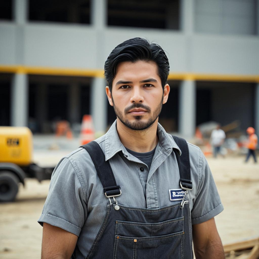Photograph of a male construction worker standing in front of a rocky background, wearing a blue hard hat, orange and brown safety vest with reflective stripes, black undershirt, tan pants, black belt, black harness with safety straps, short brown hair, slight mustache, light skin, serious expression, realistic style, outdoor setting, daylight, neutral colors in the background, centered composition, frontal view, professional attire, construction industry, rugged ure, practical clothing, industrial safety gear, focused lighting, slight shadowing, no visible props, realistic details, medium close-up, straightforward portrayal, realistic ures and materials, workwear focus