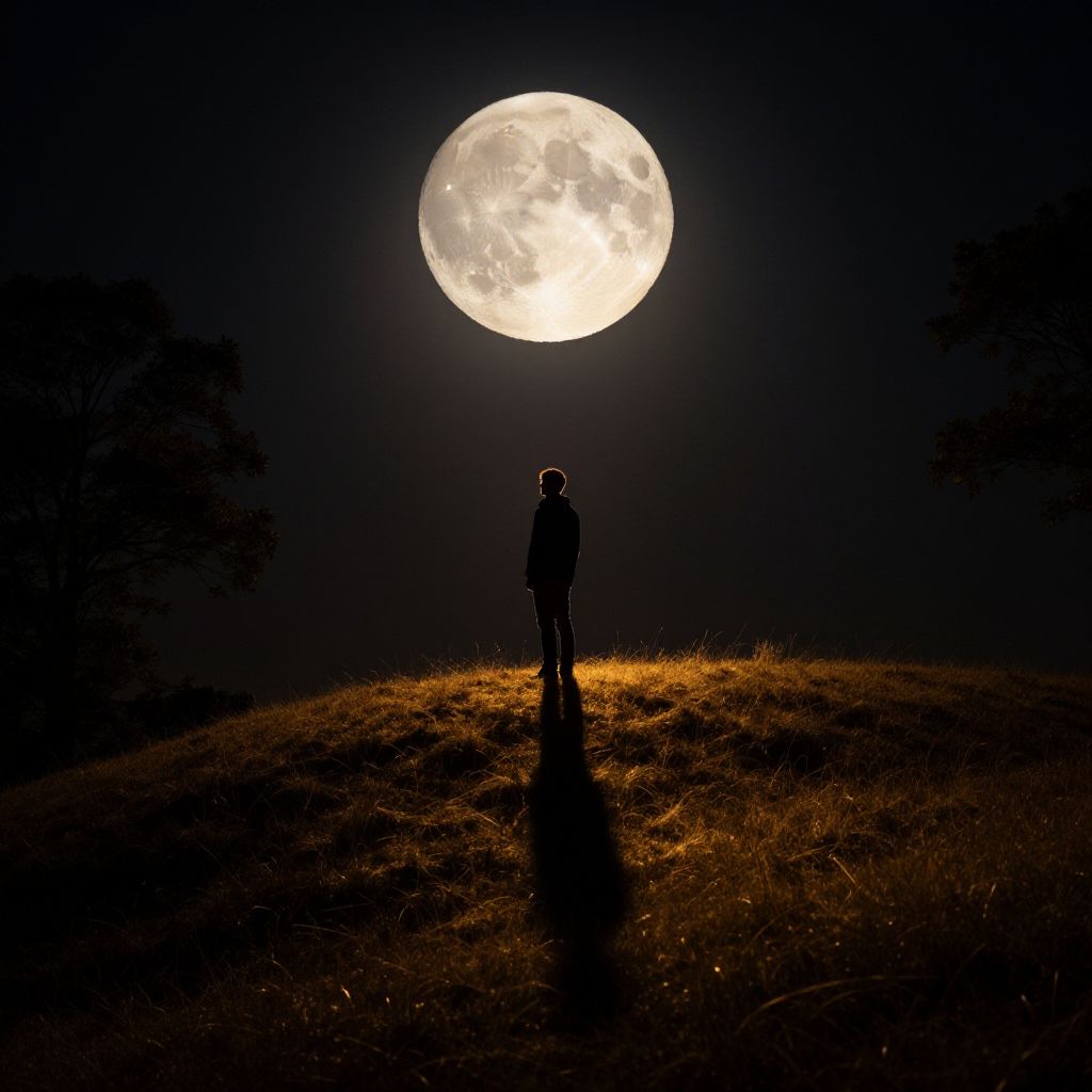 Captivating nighttime scene: A solitary figure stands atop a rolling hill, lost in contemplation as he gazes up at an enormous, radiant full moon suspended above him. Soft, golden light from nearby trees casts long shadows across the grassy terrain, while the subject's silhouette is dramatically highlighted against the dark sky. The lunar orb glows with eth Man has masculine face and piercing eyes