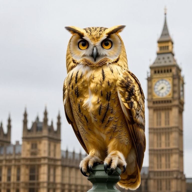 A majestic, golden owl with piercing eyes and feathered crowns perches serenely against the backdrop of Big Ben, as if guarding the timeless secrets of a world where myth and reality intertwine.
