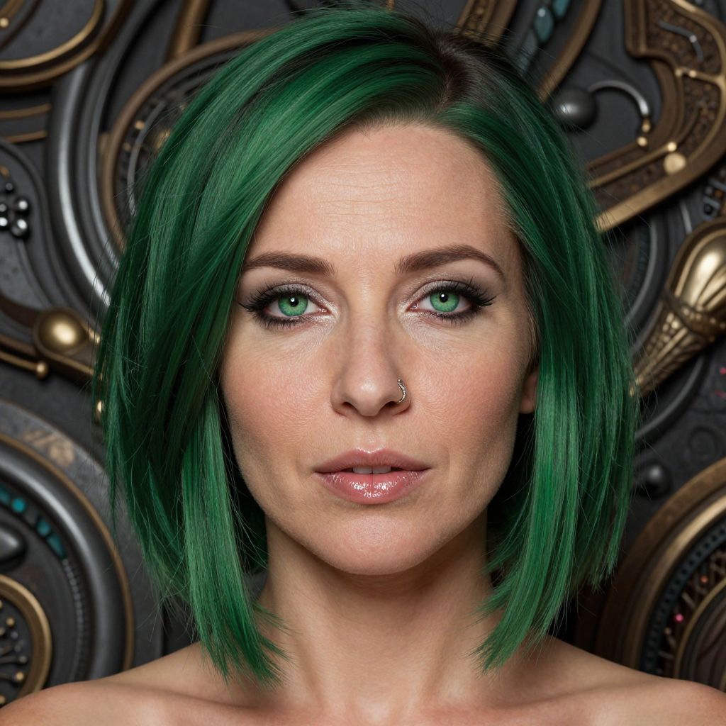 A superrealistic portrait of a Slavic woman with vibrant green hair styled in an asymmetrical bob, her captivating emerald eyes enhanced by intricate eyeliner. Full lips shine with a subtle gloss and a delicate ring adorns her left nostril. The lighting highlights the natural texture of her skin, emphasizing fine lines and gentle wrinkles around her eyes that speak to a life well-lived. In the background, an intricate abstract composition blends metallic shapes with organic forms, seamlessly fusing futuristic technology and earthy elements in perfect harmony. This portrait captures the essence of wisdom and resilience, inviting viewers to explore the layers of her character through a unique interplay of light, shadow, and meticulously crafted details that bring her story to life.