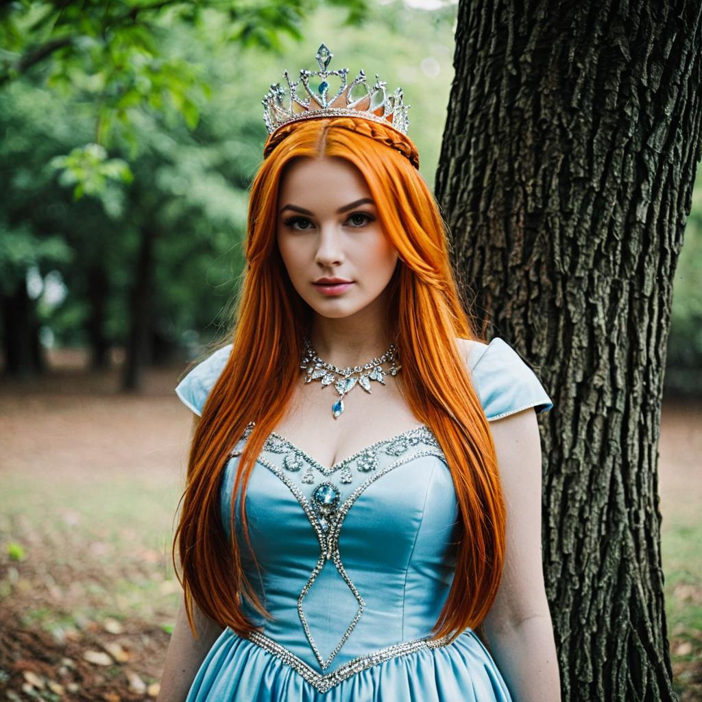 God cosplay,1girl, solo, long hair, dress, orange hair, looking at viewer, tree, jewelry, blurry background, blurry, tiara, outdoors