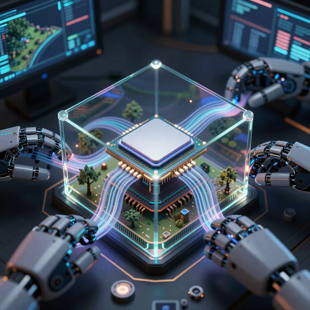 Close-up of AI model training process showing a sleek AI chip embedded in a crystal-clear glass cube, data streams flowing into it from surrounding digital landscapes, surrounded by cybernetic hands adjusting settings, glowing softly in dark, tech-heavy environment.