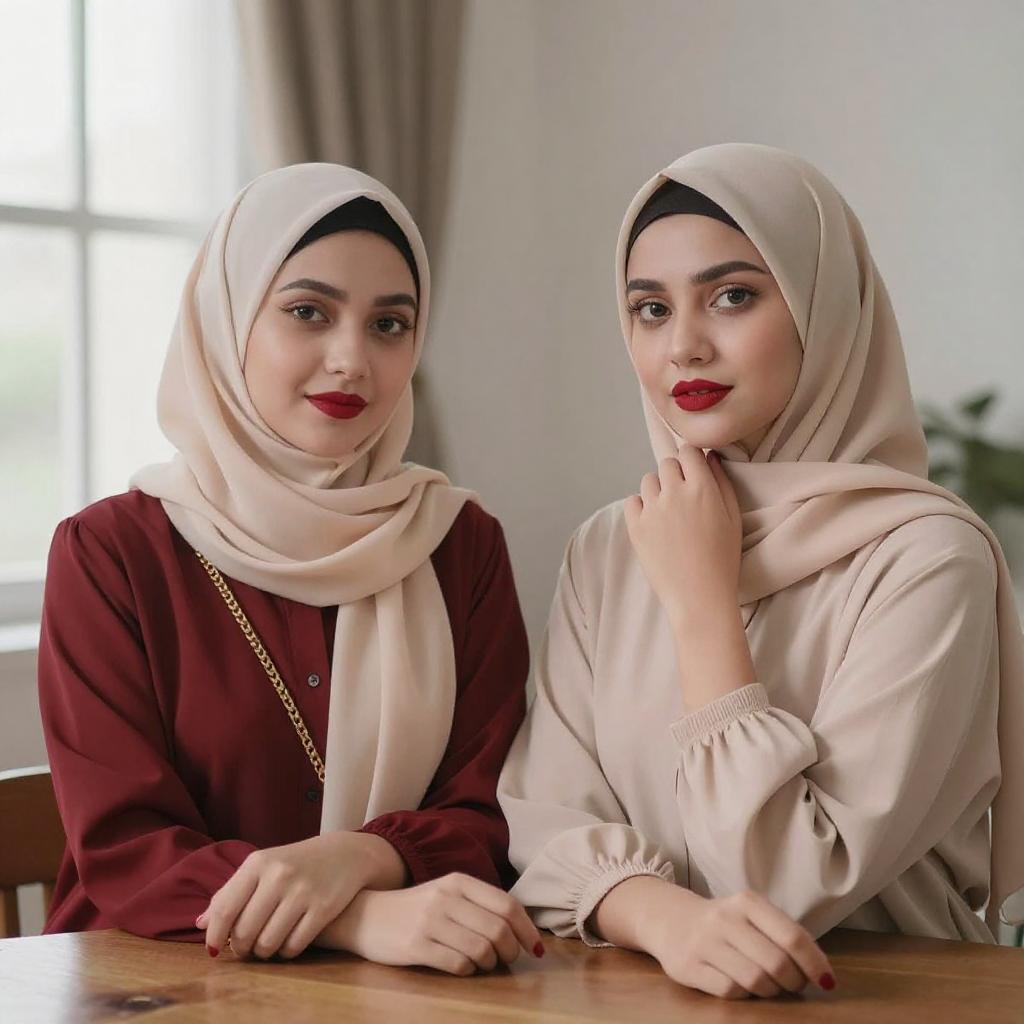 Photograph of two young women with fair skin and red lipstick, wearing beige hijabs and red and beige long-sleeve tops. The woman on the left wears a red top with a gold chain, while the woman on the right wears beige. They lean on a wooden table, with brown curtains and a window in the background.